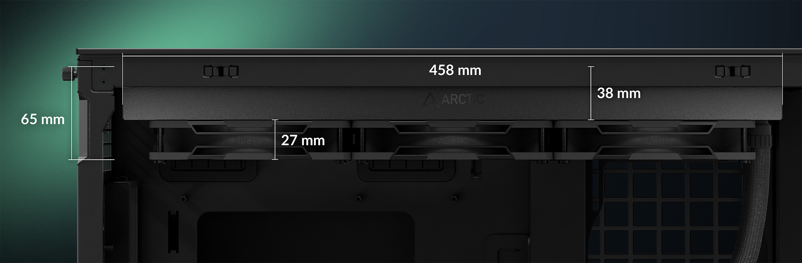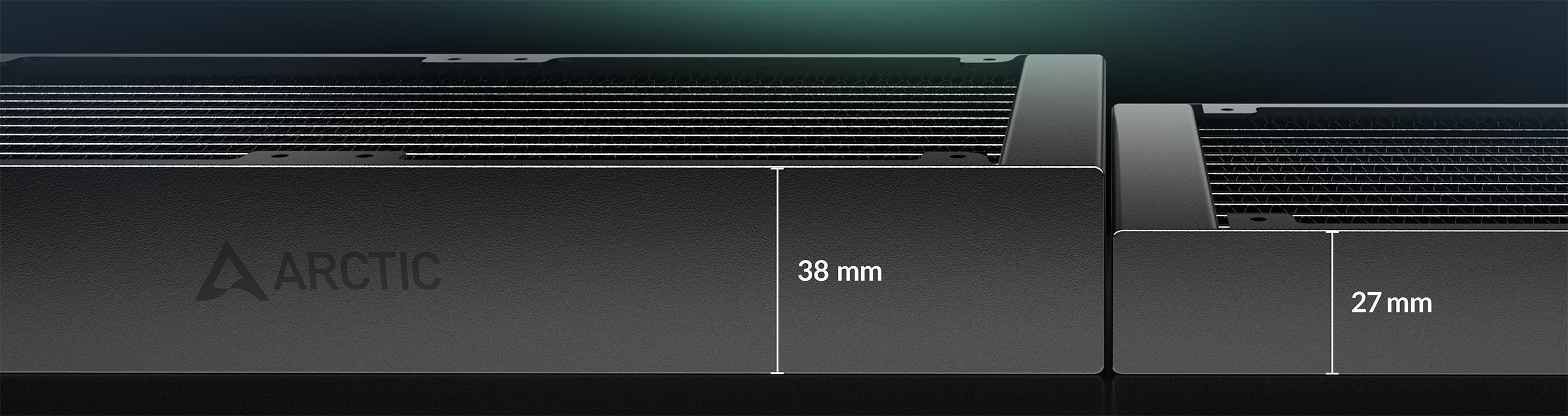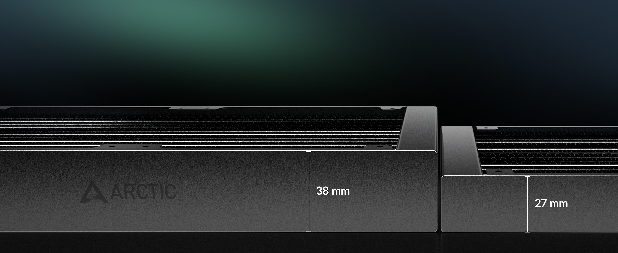 Der 38-mm-Radiator ermöglicht nicht nur eine bessere Wärmeabgabe, sondern besitzt auch ein größeres Flüssigkeitsvolumen als herkömmliche 27-mm-Radiatoren. Das reduziert Wärmestau und sorgt für eine effizientere Bewältigung von Temperaturspitzen.