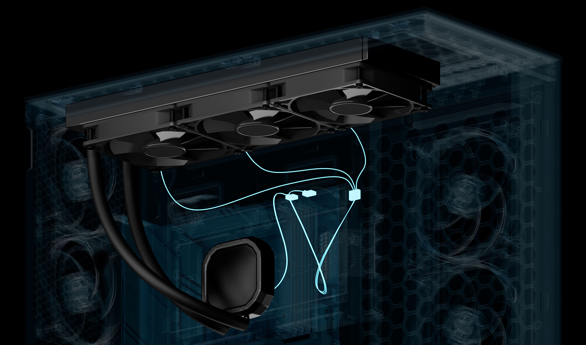 INTEGRATED CABLE MANAGEMENT: The PWM cables of the radiator fans are integrated in the sheathing of the hoses so that only a single visible cable is connected to the motherboard