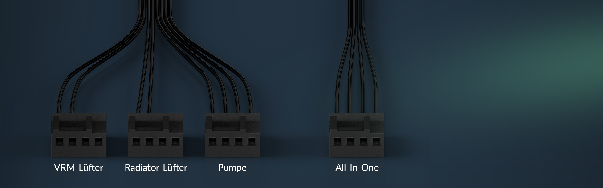 Mit dem Splitter-Kabel können die Pumpe, der VRM- und die Radiatorlüfter entweder separat gesteuert oder gemeinsam über ein einziges PWM-Signal mit dem All-in-One-Kabel geregelt werden.