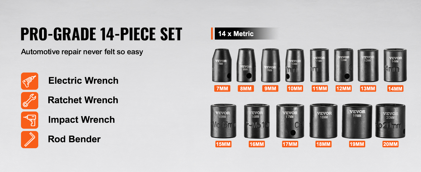 Avec une configuration pro, cet ensemble peut être utilisé avec une clé électrique, une clé à chocs, une clé à cliquet, une cintreuse à tige et d'autres outils pour l'entretien automobile, l'assemblage d'équipements, la fabrication industrielle, les inspections électriques, etc.
