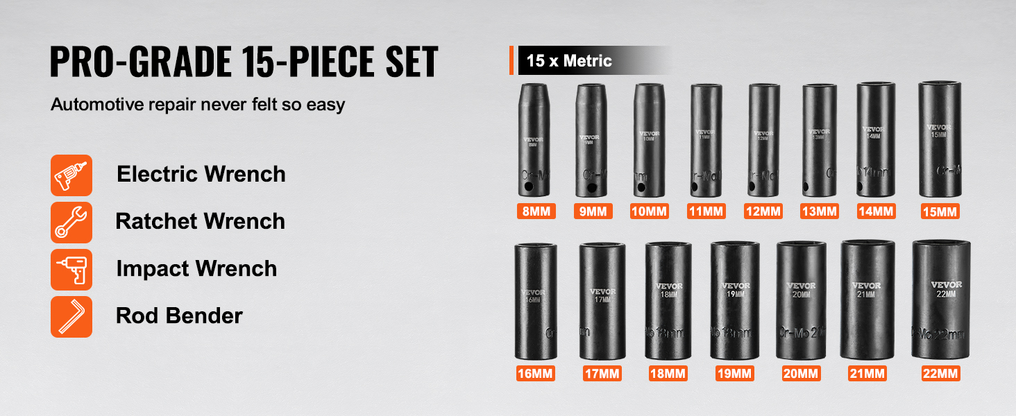 Avec une configuration pro, cet ensemble peut être utilisé avec une clé électrique, une clé à chocs, une clé à cliquet, une cintreuse à tiges et d'autres outils pour l'entretien automobile, l'assemblage d'équipements, la fabrication industrielle, les inspections électriques, etc.