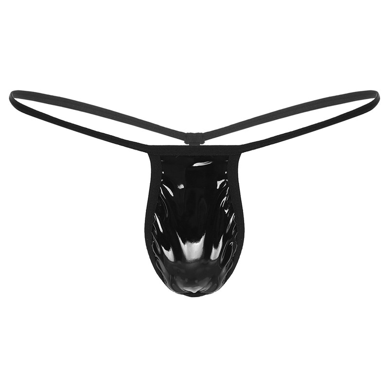 Low rise t-back for men, patent leather bulge pouch, elastic waistband for better fit.