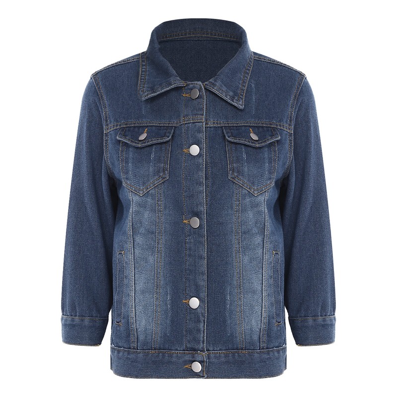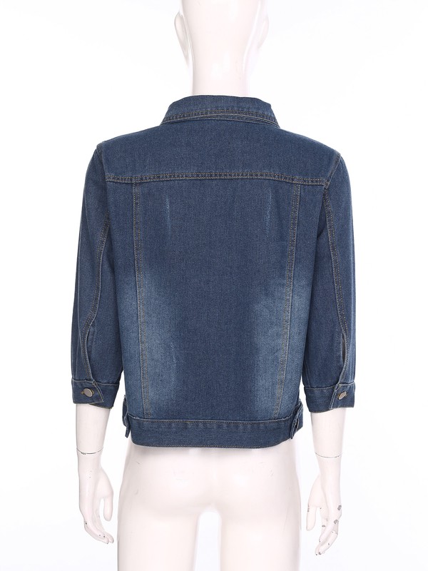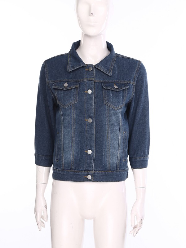 Casual denim jacket features 3/4 sleeve, turn-down collar, button closure, regular fit.