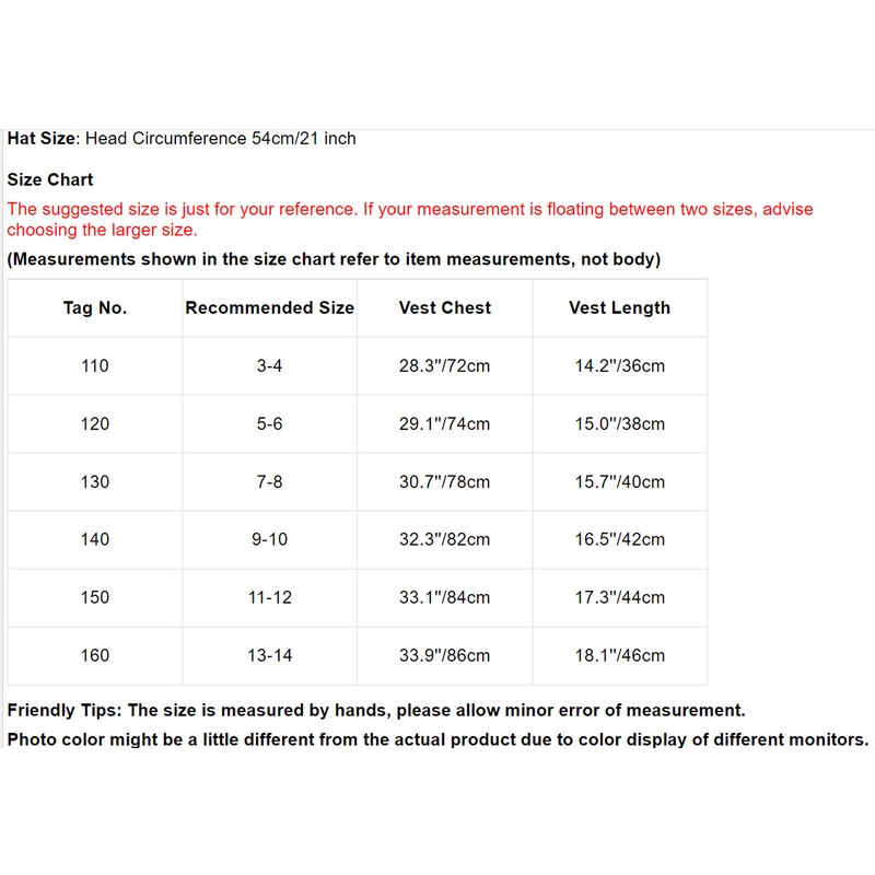 | Tag No. | Recommended Size for Kids | Waist | Length |