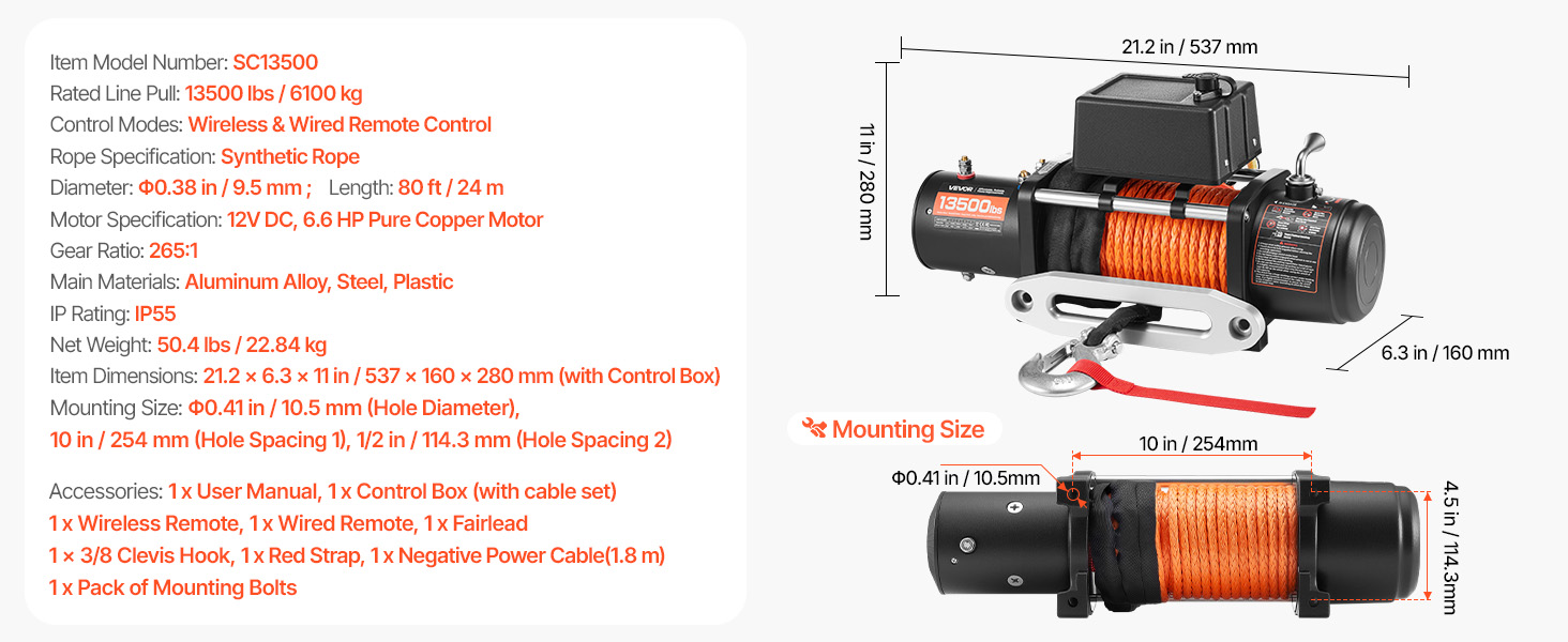 Force de traction de 6100 kg : Ce treuil électrique offre une force de traction de 6100 kg, ce qui permet de récupérer rapidement et sans stress un VUS ou une camionnette dans la boue ou le sable, sans souci de distorsion des engrenages