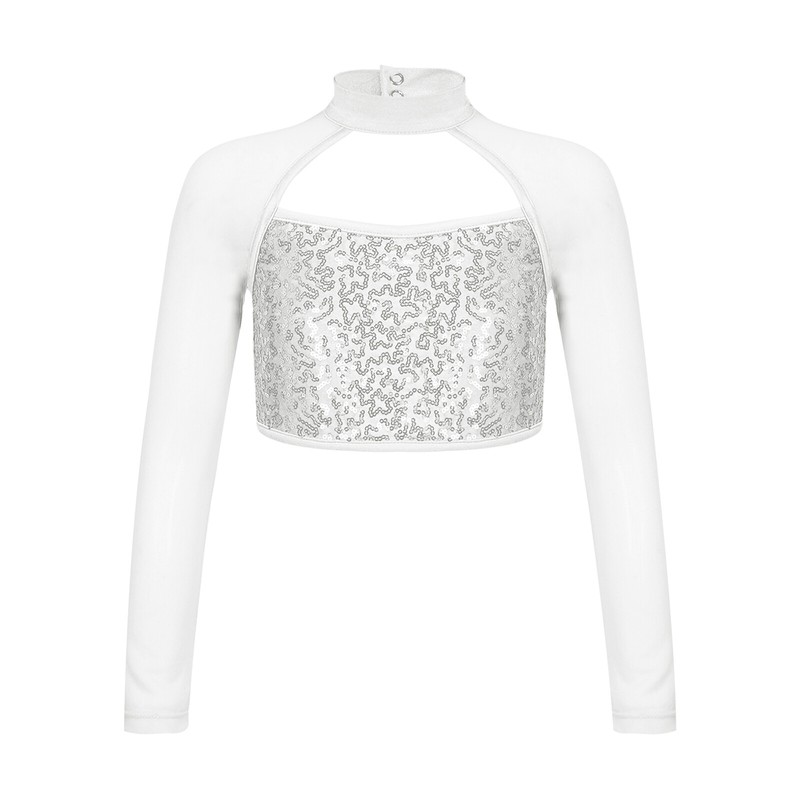 The long sleeve crop top with sequins that sparkle under the light to brighten up any performance.