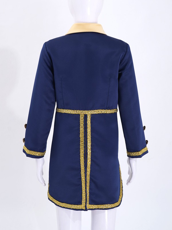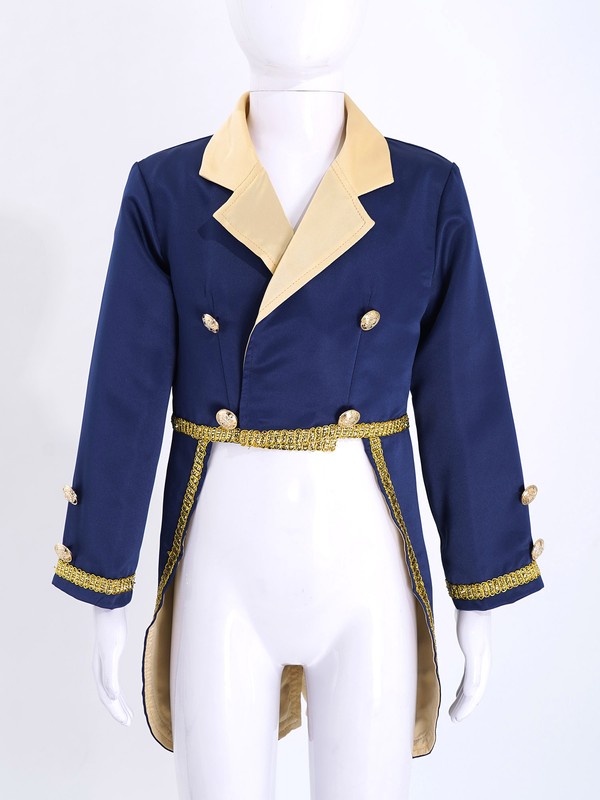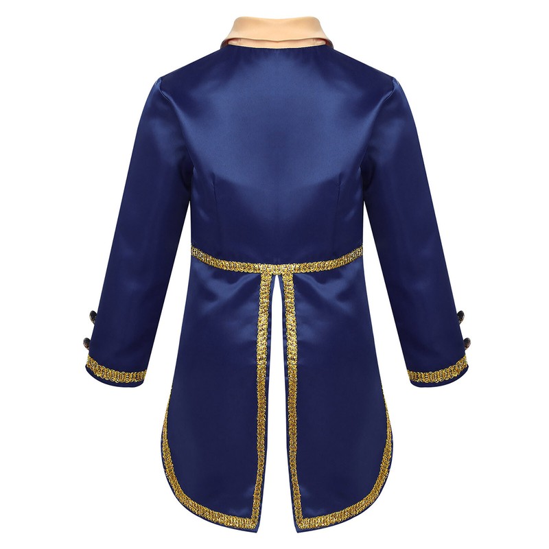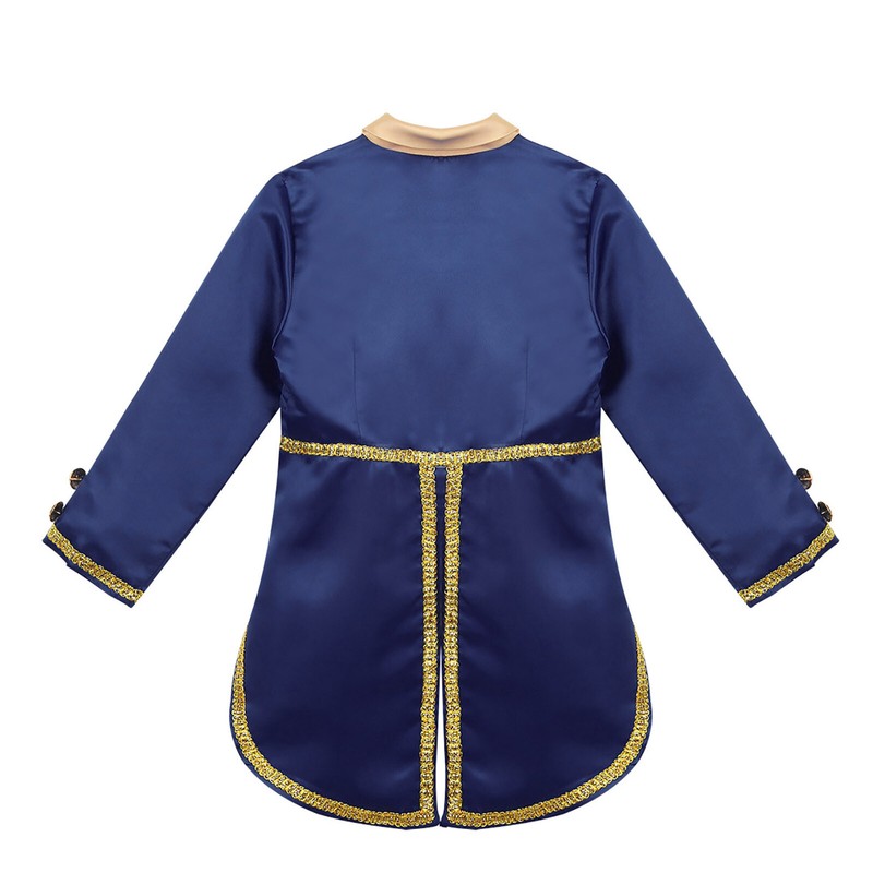 Gold braided trimmings embellish the wrists and around the tails. Fully lined. Handsome prince costume for your boy.