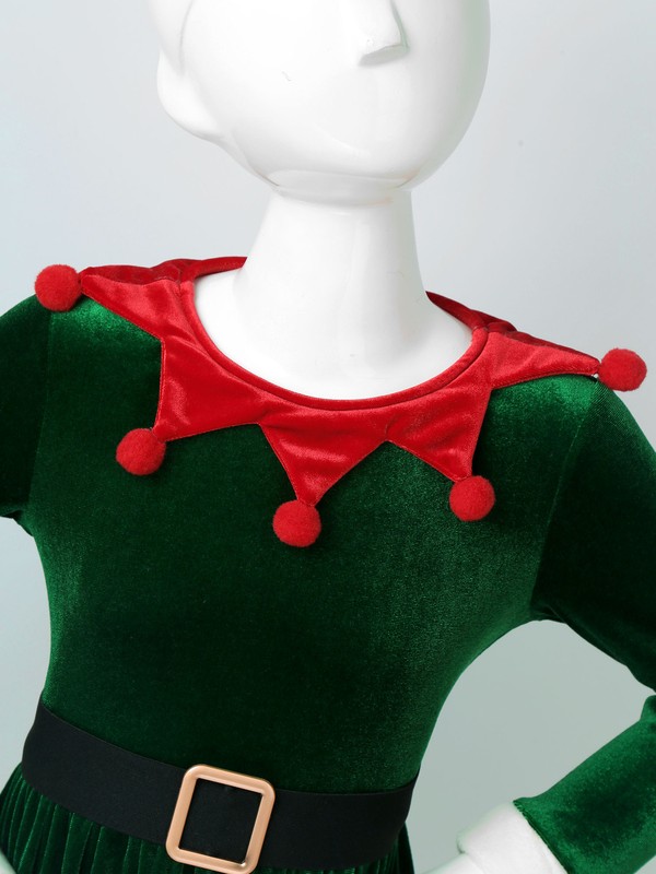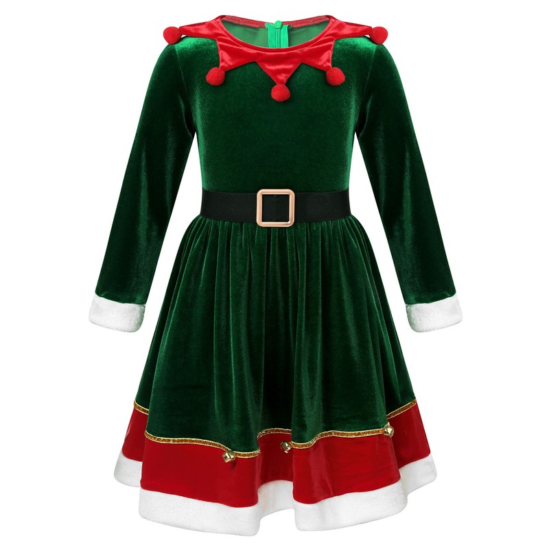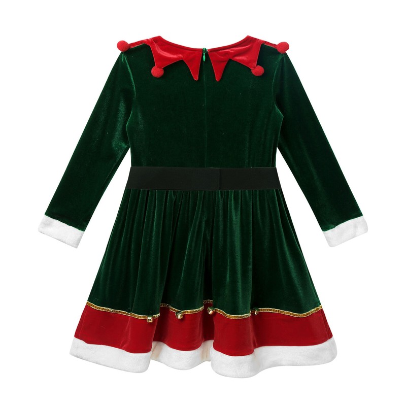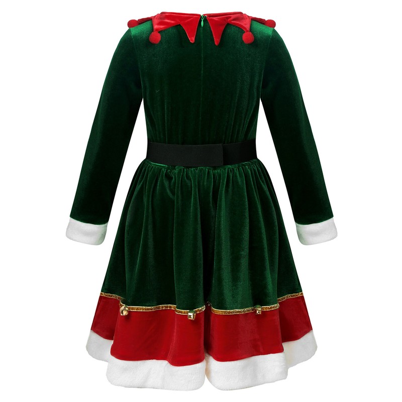 Single layer thin velvet dress, gold hem adorned with bells,dinging as move. Perfect for your little girls’ and big girls’ Christmas holiday wearing.