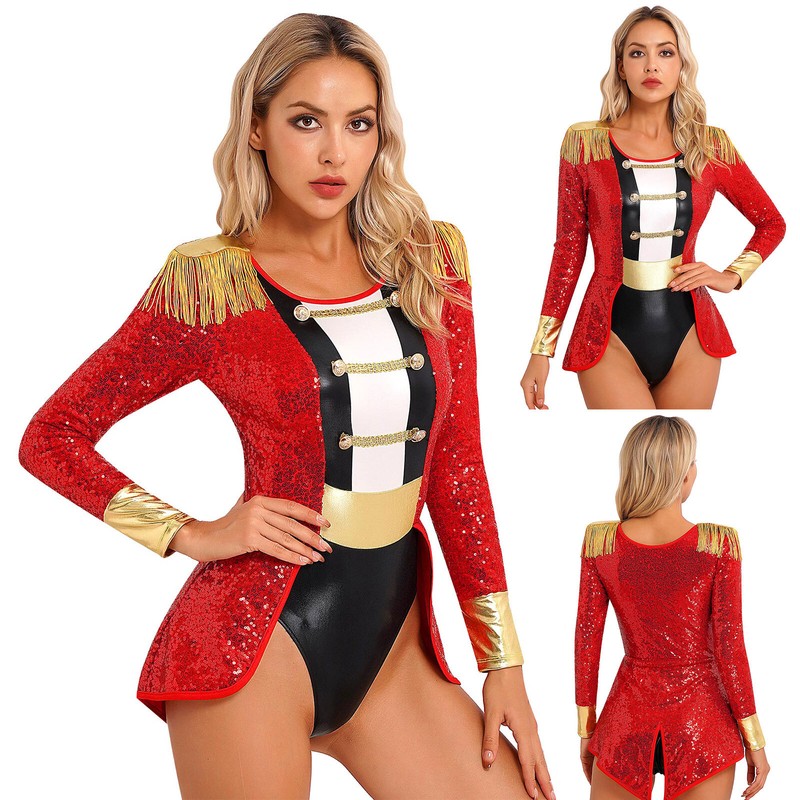 Women circus cosplay bodysuit designs with long sleeve, tassel epaulettes, button crotch and patchwork tails skirted.