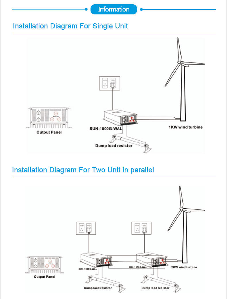 - Eingebauter Dump Load Controller - dreiphasiger Wechselstromeingang von der Windkraftanlage - Einphasiger Wechselstrom zum Netz (220 V 230 V 240 V) - Eingebaute Leistungsbegrenzungsfunktion