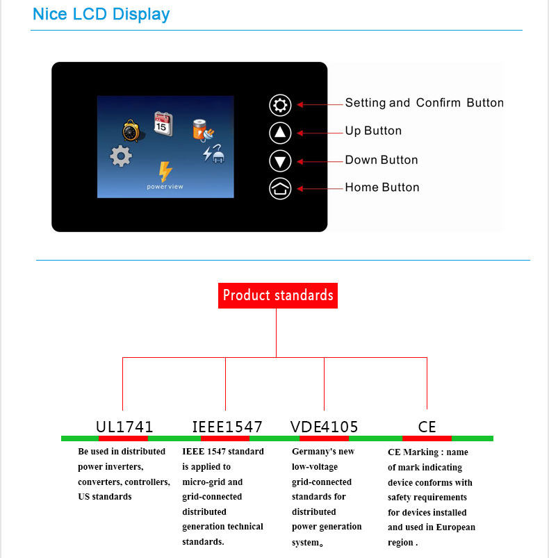 * der Netzwechselrichter der 2. Generation, neue technische, höhere Effizienz. * Höhere MPPT-Effizienz, max. 99% * Mehrfacher intelligenter Schutz für eine sichere Verwendung. * Direkt an eine dreiphasige Windkraftanlage ohne Regler anschließen * Einfach zu installieren und einfach zu bedienen. * Zwei Jahre Garantie, lebenslanger technischer Support. * Reine Sinuswellenausgabe * Eingebaute Dump-Ladefunktion * Zwei Jahre Garantie, lebenslanger technischer Support. * Leistungsbegrenzungsfunktion