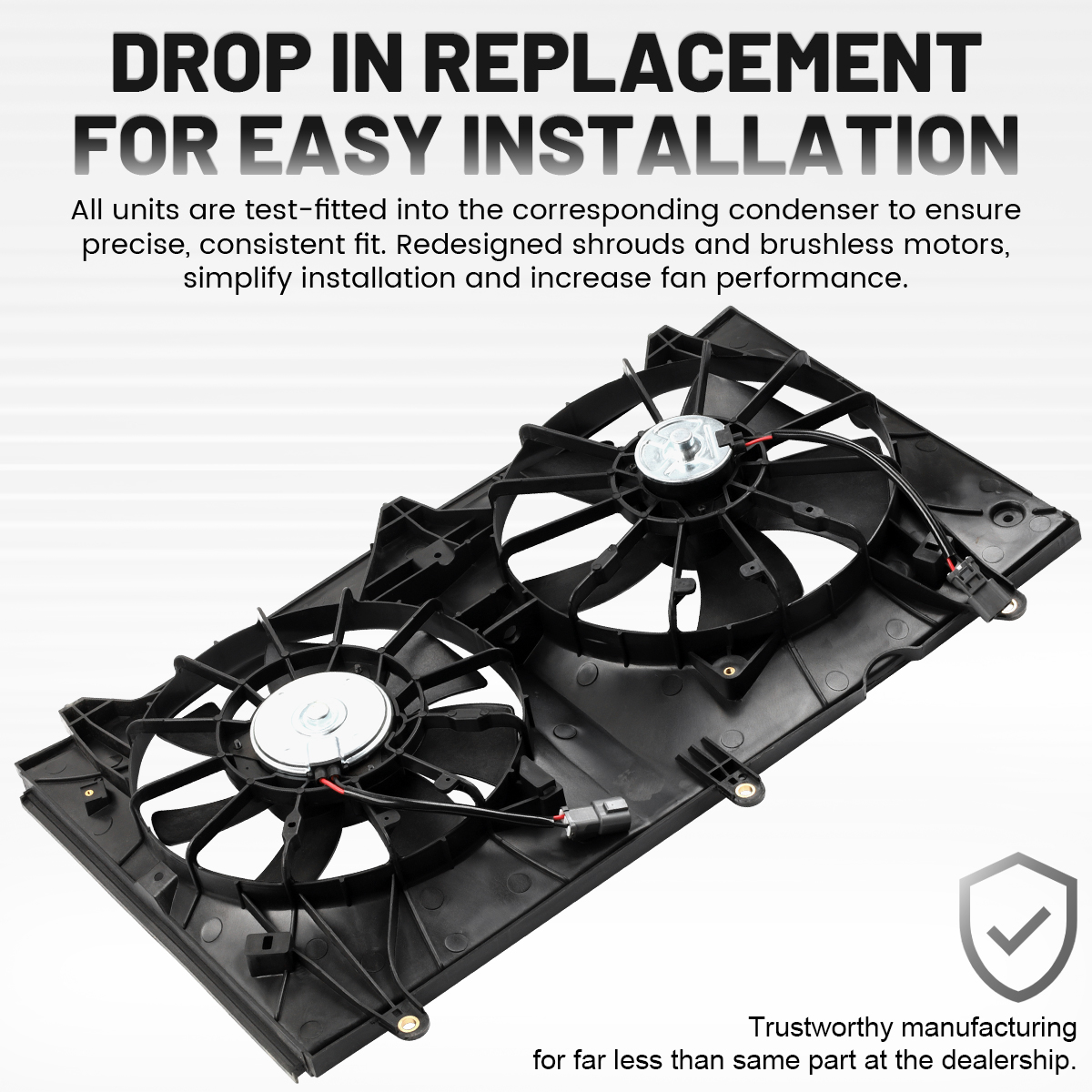1.Drop in replacement for easy installation.All units are test-fitted into the corresponding condenser to ensure precise, consistent fit. Redesigned shrouds and brushless motors, simplify installation and increase fan performance.