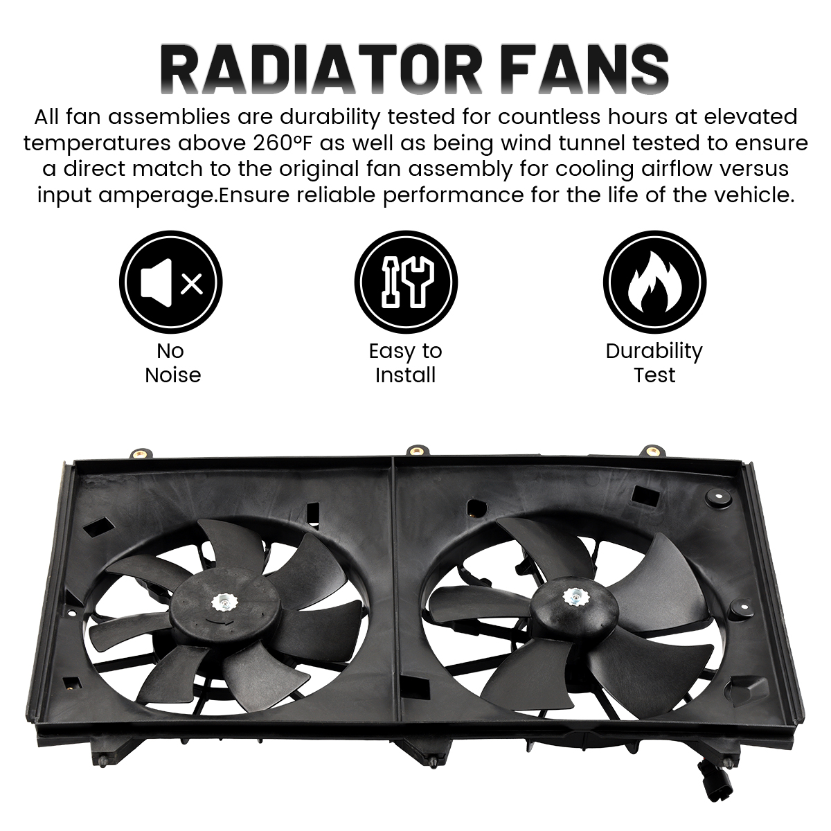 4.All fan assemblies are durability tested for countless hours at elevated temperatures above 260°F as well as being wind tunnel tested to ensure a direct match to the original fan assembly for cooling airflow versus input amperage.Ensure reliable performance for the life of the vehicle.