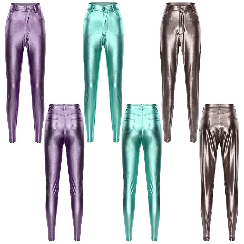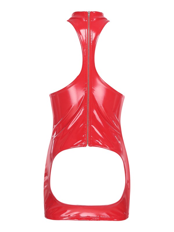 Crafted from a blend of patent leather, polyester, and metal, the dress is shiny and durable, offering a unique tactile experience.