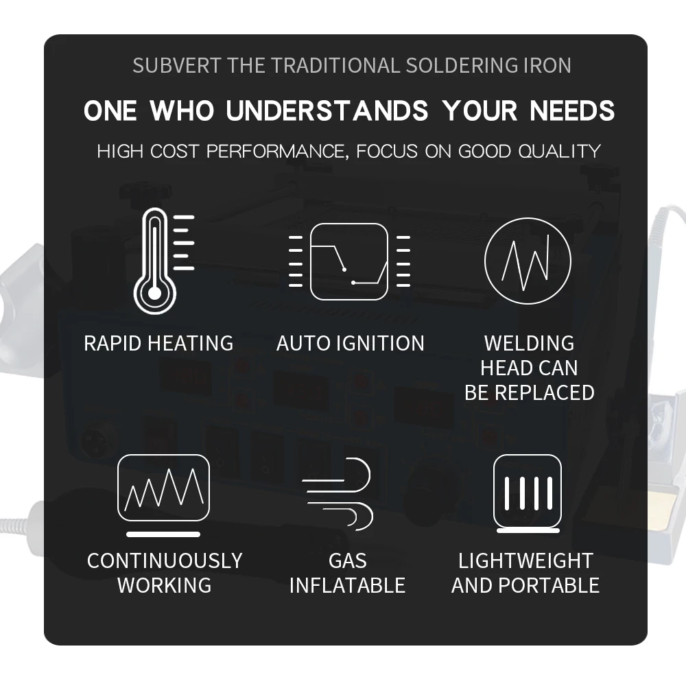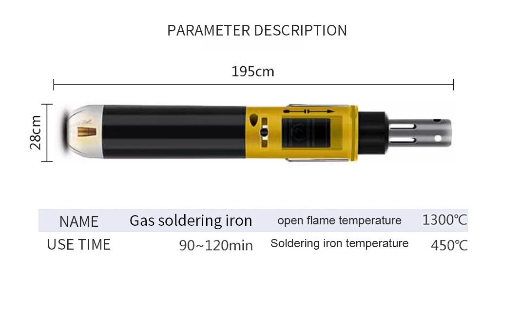 Can be used as ordinary soldering iron, heat gun or flame gun, very practical.