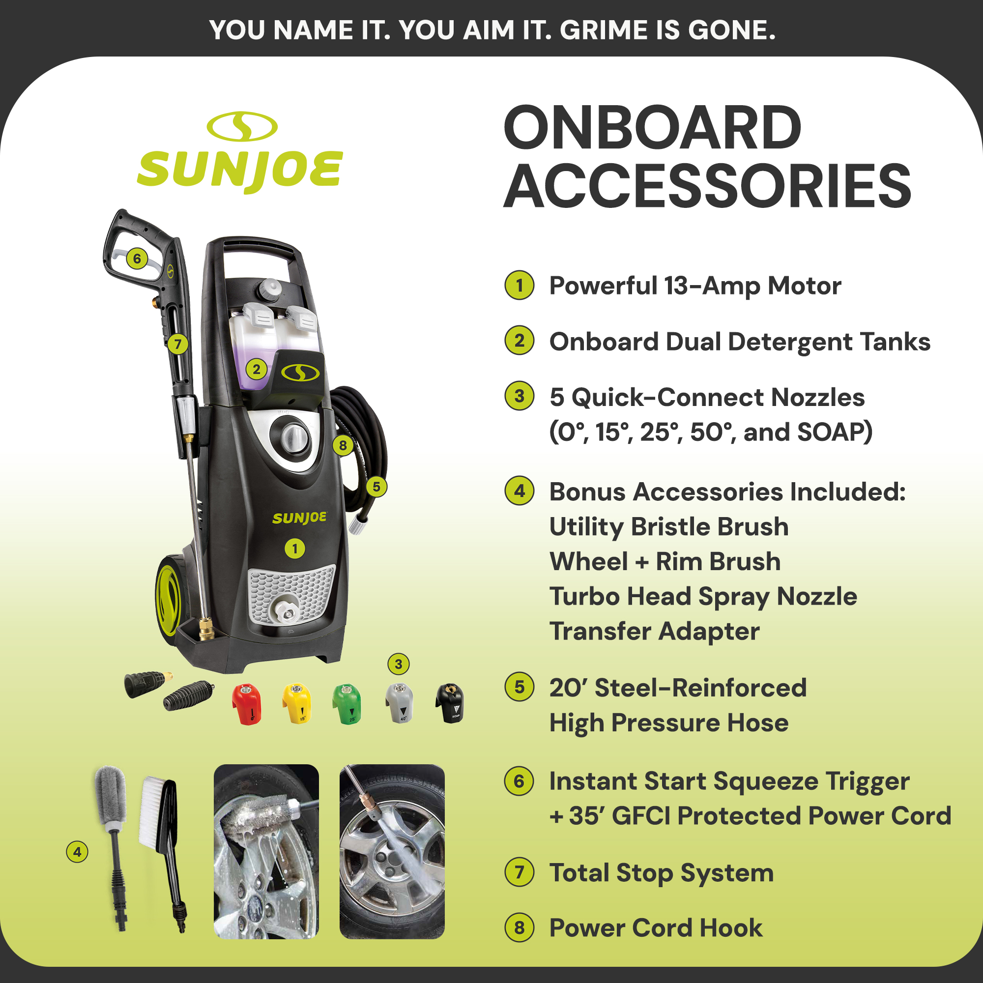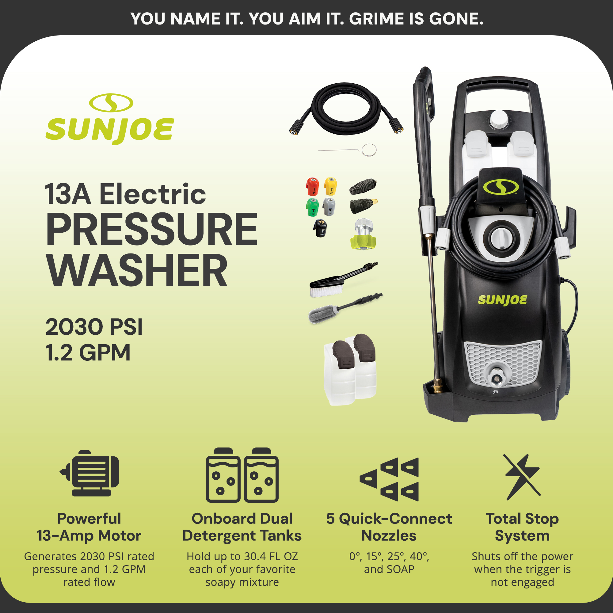 Plus, the power washer rear wheels provide easy portability around your yard. Tailor the pressure output of the spray to your cleaning needs with the 5 Quick-Connect spray nozzles. A 20-foot high-pressure hose, 35-foot power cord, garden hose adapter, and a TSS (Total Stop System) trigger are included. Featuring a utility bristle brush and a wheel plus rim brush, this power washer set comes with everything needed to ensure your house and car are kept clean.