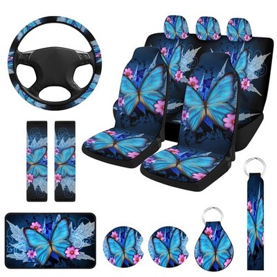 Package IncludesPack includes car seat cover sets full set+1 steering wheel cover+2 shoulder guards+1 armrest pad+2 coasters+1 keychain+1 wristband strap total of 15 pieces, a complete combination can protect and decoration your car very well,makes your car unique and charming.
