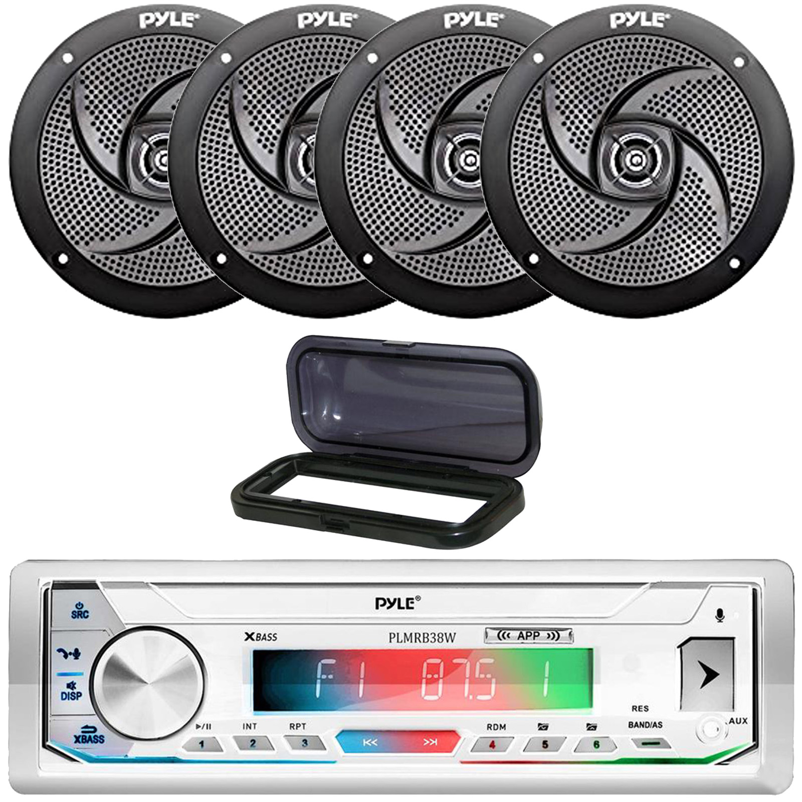 • PACKAGE BUNDLE INCLUDES: Pyle PLMRB39W LCD Display Single-DIN Marine Bluetooth USB/AUX MP3 Player AM/FM Radio Stereo White Receiver W/Remote Control, Black Radio Shield Cover, 4x Pyle PLMRS5B 5.25" 180 Watt Max Power 2-Way Waterproof Low Profile Slim Style Boat Audio Black Speakers