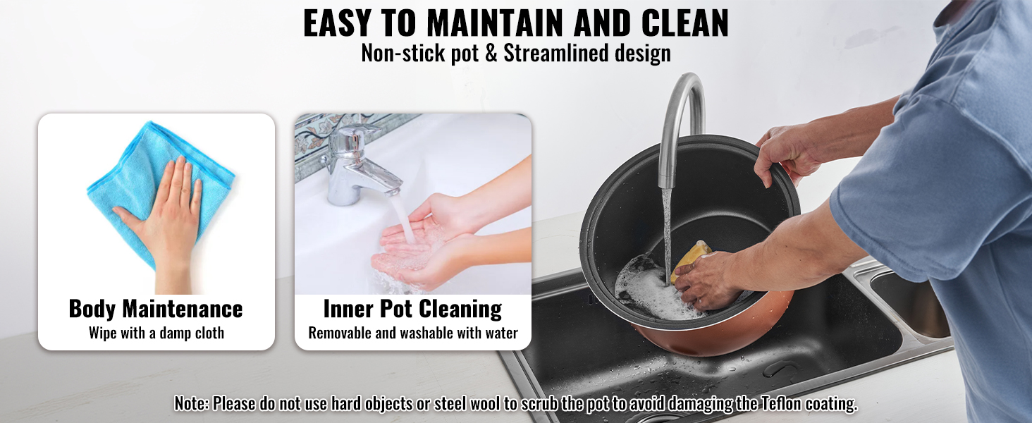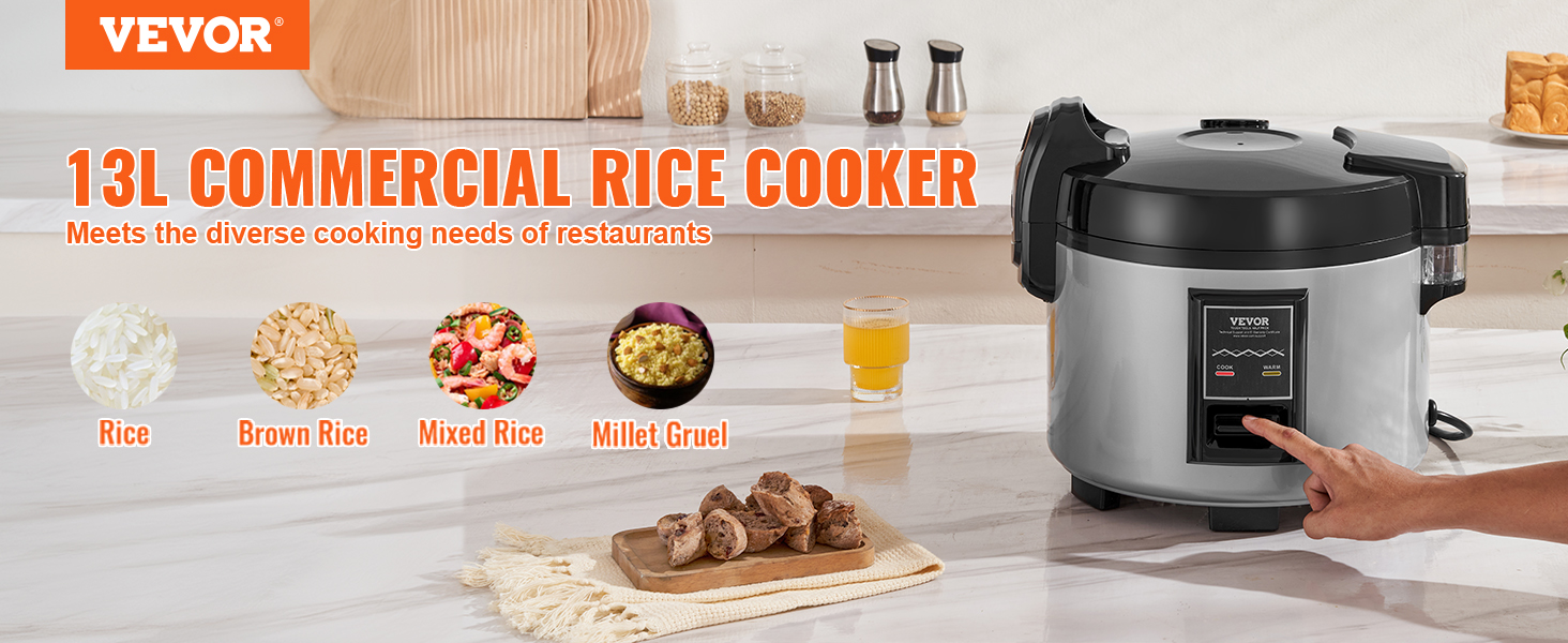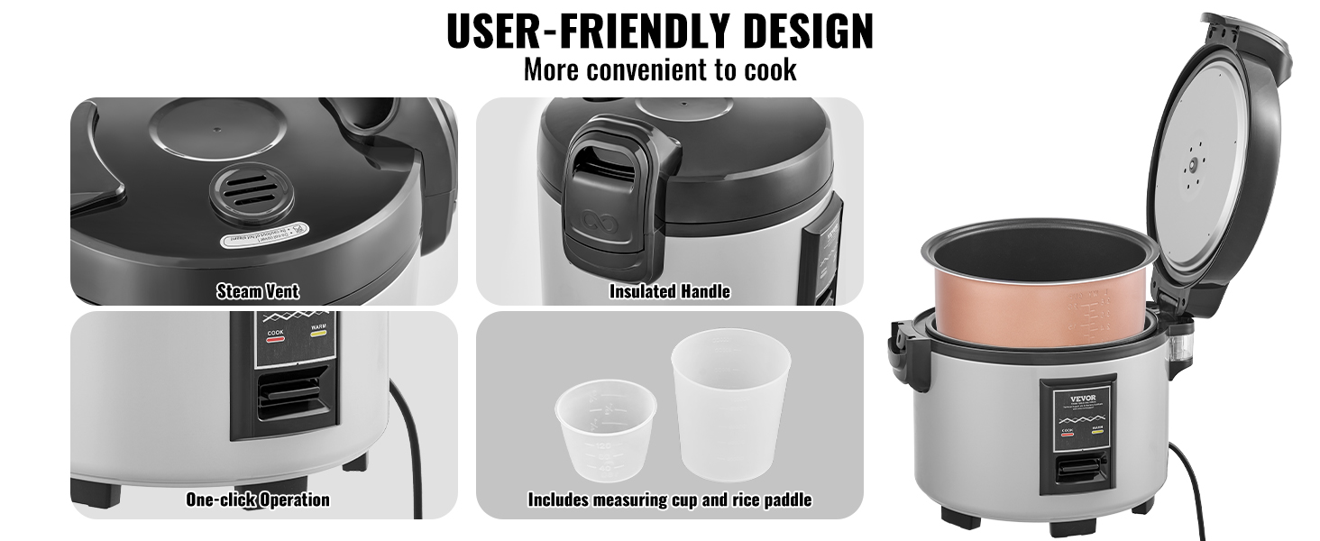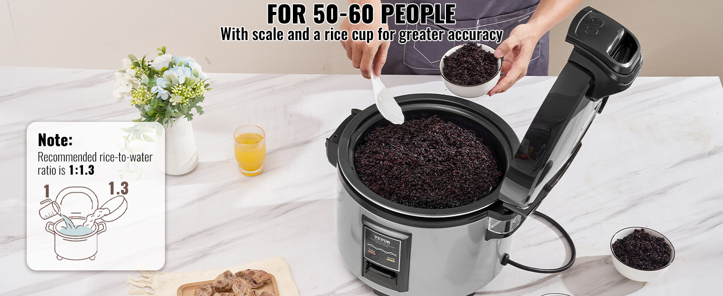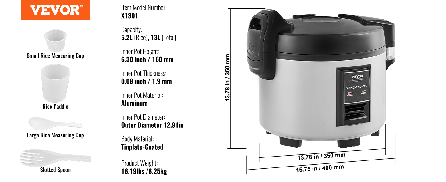 Esta olla arrocera comercial tiene una capacidad total de 13 litros y cocina 5,2 litros de arroz a la vez, lo que equivale a 60 tazas de arroz, lo que la hace perfecta para servir a 50-60 personas. Además, puede preparar delicioso arroz integral, arroz mixto, gachas de mijo y más.