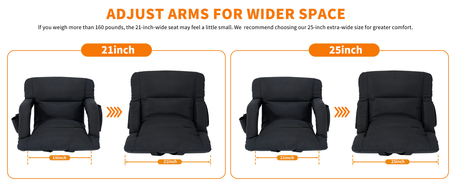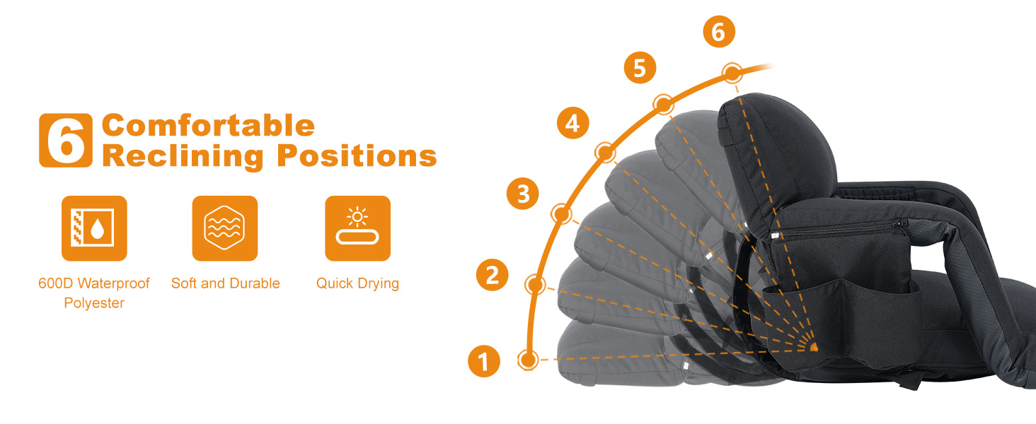 【6 RECLINING POSITIONS】The bleacher seats can avoid the muscle soreness caused by sitting for a long time, you can focus more on your game or performance. The stadium chair has 6 reclining options, you can choose the most comfortable position to enjoy your happy time