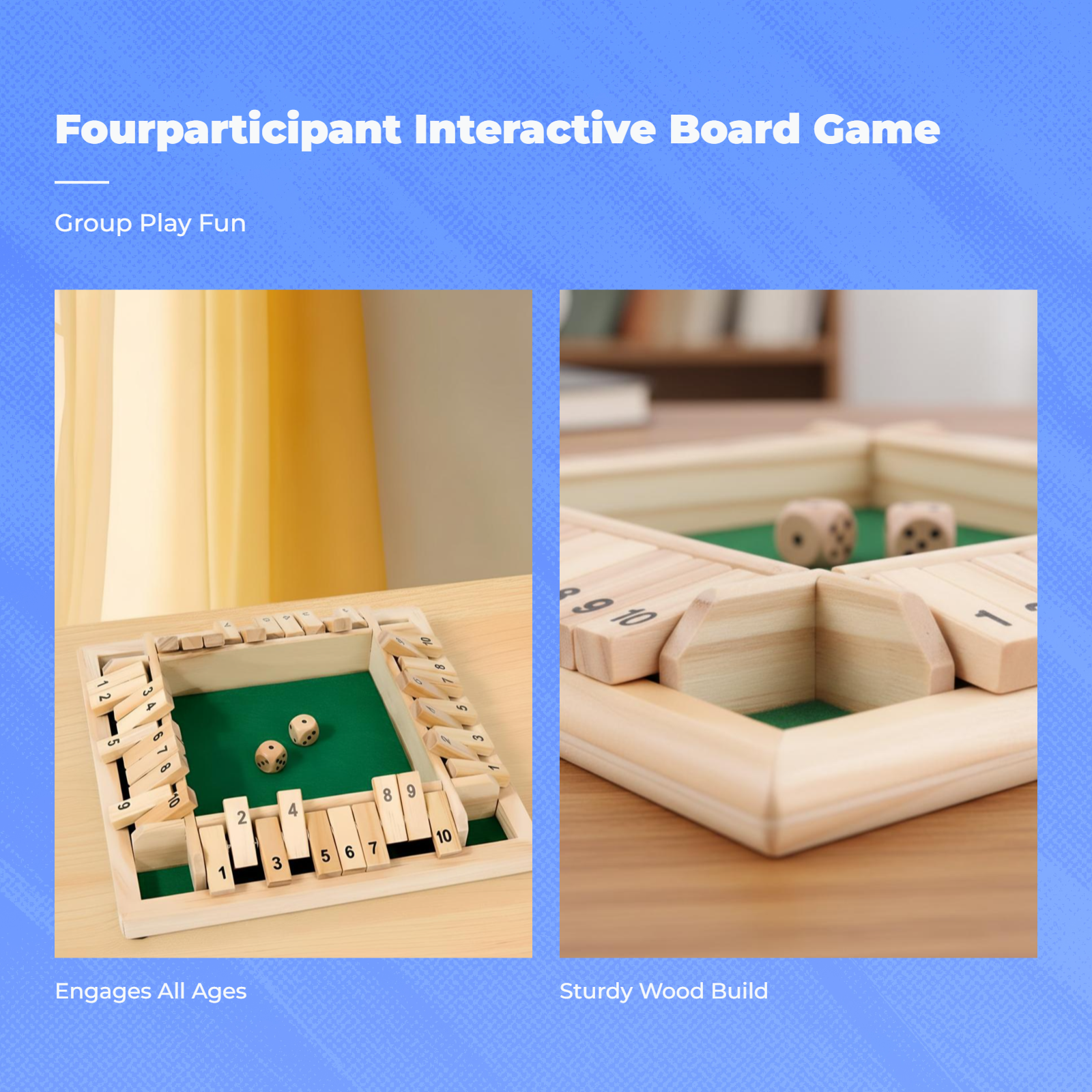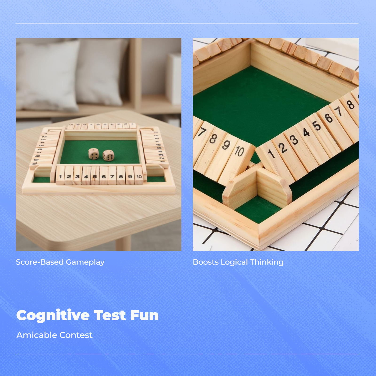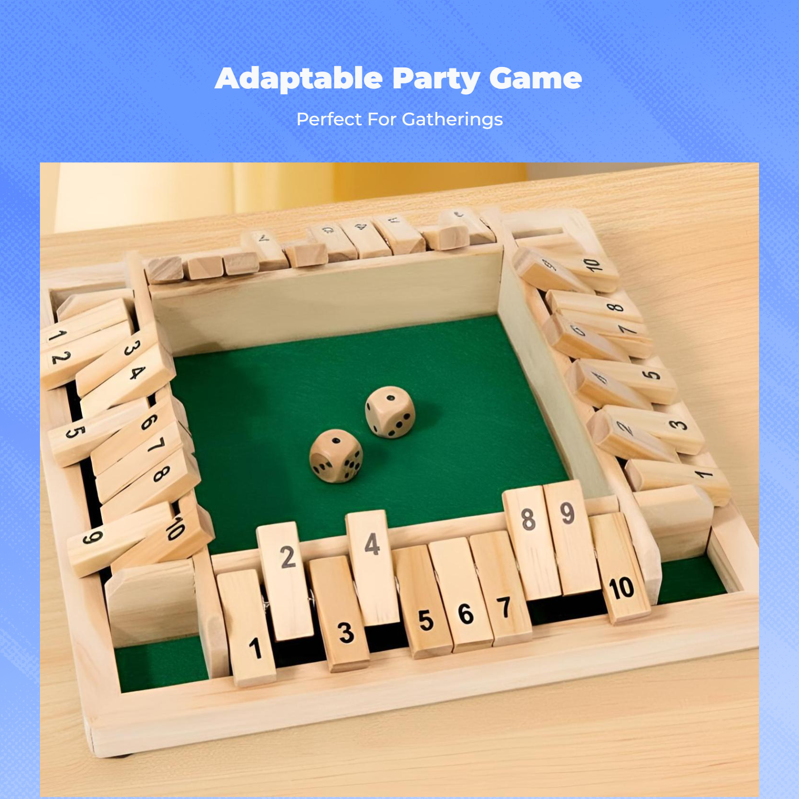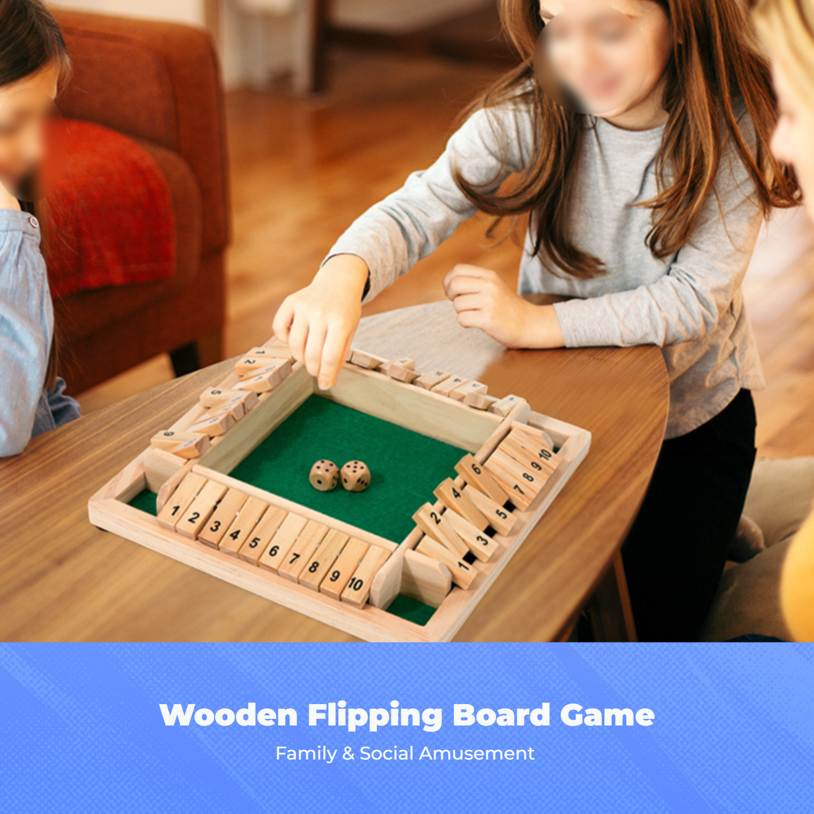 Dieses klassische Holzbrettspiel „Shut the Box“ ist vierseitig aufgebaut und verfügt auf jeder Seite über zehn nummerierte Klappen von 1 bis 10. In der Mitte befindet sich eine grün ausgelegte Spielfläche mit zwei Holzwürfeln. Das Spiel eignet sich für bis zu vier Personen und kann von Kindern wie Erwachsenen gemeinsam gespielt werden.