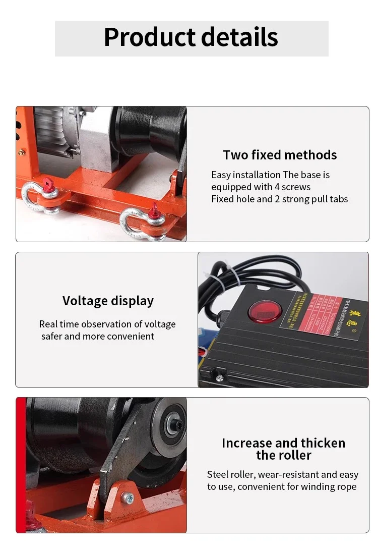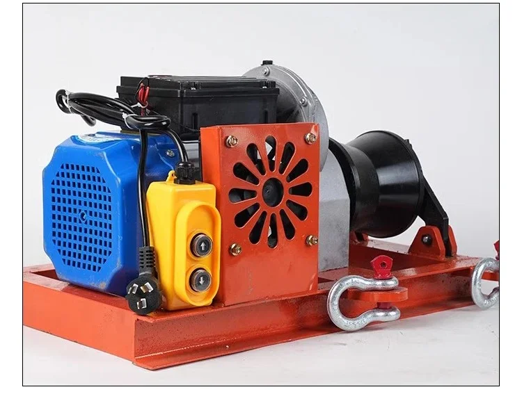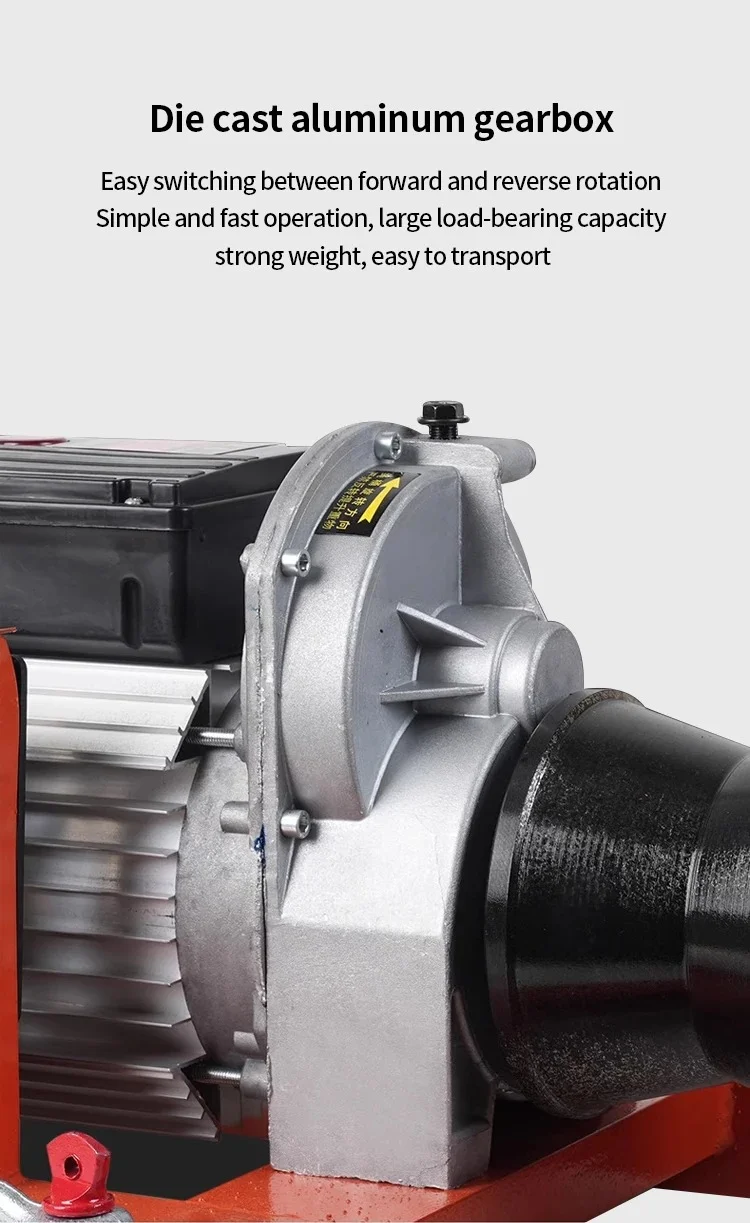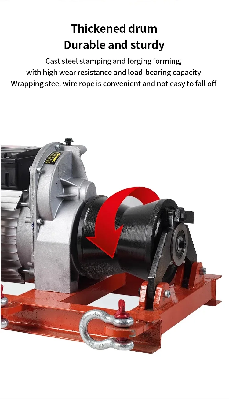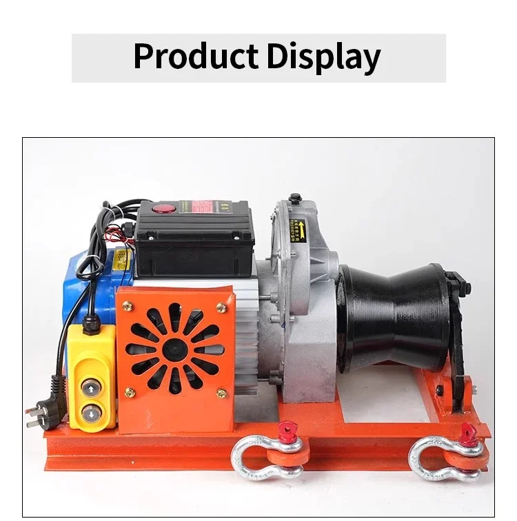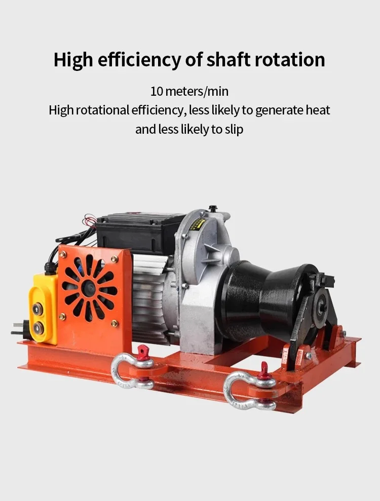 Portable cable traction machine, small electric winch, Cable pulling device 220V 1 ton winch remote control model Motor power: 3KW Overall dimensions: 50*35*30cm Operating speed: 12 meters per minute Overall weight: approx. 35 kg
