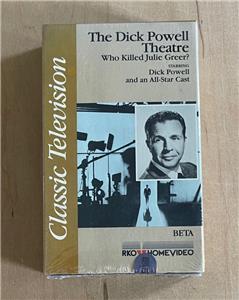 RKO Home Video, #RKO 3008. The Dick Powell Theatre: Who Killed Julie Greer? (1961) starring Dick Powell, Nick Adams, Mickey Rooney, Ronald Reagan, and more. An L.A. detective has inherited millions and usually arrives at crime scenes in a chauffeur-driven Rolls-Royce. Investigating the death of actress Julie Greer, he finds lots of suspects - but the killer's identity surprises him. Cult classic TV Movie mystery. This betamax is new and factory sealed (distributor's security tab is intact under unopened shrink wrap). The box is mint with no fading or wear. The shrink wrap has a small separation on the bottom edge. Collectible TV Movie, difficult to find.