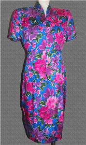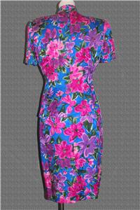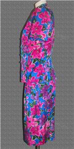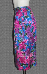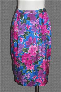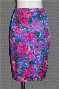 GORGEOUS VTG 2-Pc Colorful Adrianna Papell Floral Lined Lightweight Silk Skirt and Top Set. Shimmery silhouette background. Five fabric covered front loop buttons. Shoulder pads. Pencil skirt has upper front pleats. Waistband is elastic on the back, flat on the front. Back hidden zipper pancake clasp. Lower back 6-1/2" vent. Dry clean, 100% silk. Lining is acetate. Women's size 8. Approx. measurments: