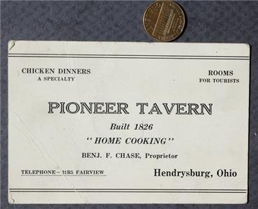 Check it out...Here's a unique original @ 4 1/2" wide by 2 3/4" tall black & white 2-sided business card from the 1930-40s Era "Pioneer Tavern" bar & restaurant in Hendrysburg, Ohio-Has a real photo image of the motel with info on one side and reads: "Pioneer Tavern Built 1826 Home Cooking Chicken Dinners A Specialty. Rooms for Tourists. Benj. F. Chase, Proprietor Telephone-31R5 Fairview Hendrysburg, Ohio" on the other side-Has only minor wear only (See photos below for clarification)-A great vintage item for display-How many of these throwaway items survived? This is an ORIGINAL item, NOT A REPRODUCTION item! Postage information is listed at the bottom-$ 4.95 postage is required.