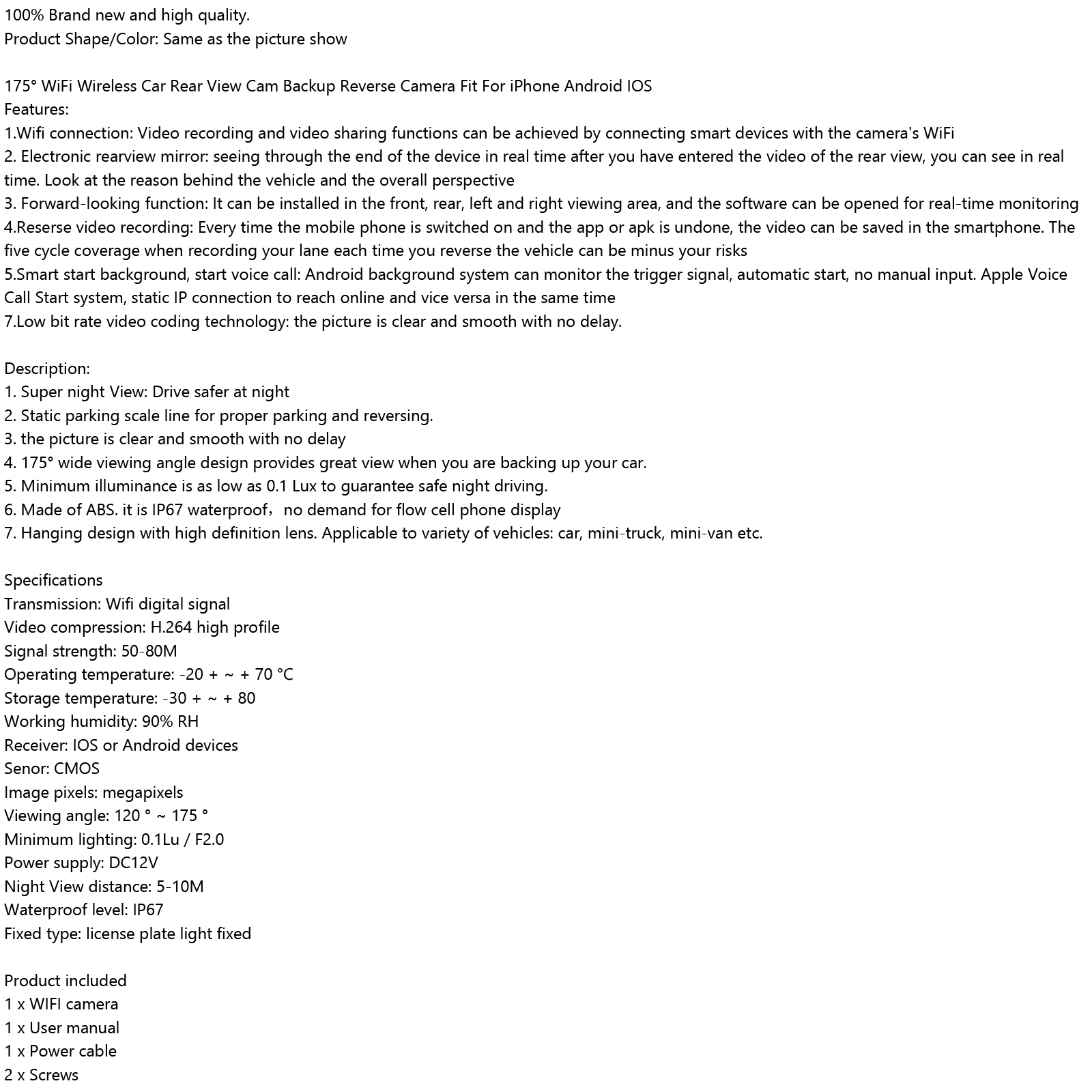 4. 175° wide viewing angle design provides great view when you are backing up your car.