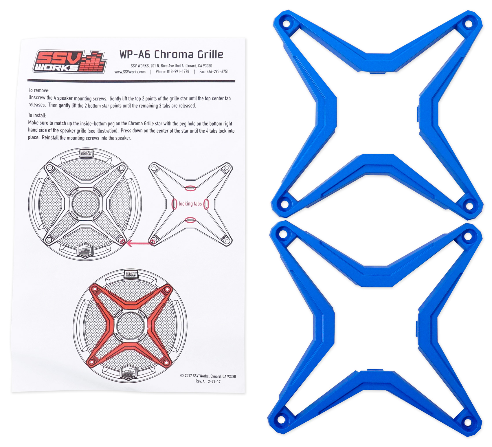 SSV Works WP-A6 speakers add acoustically transparent mesh grilles with interchangeable color inserts to add the ultimate in customization to your Side X Side. The inserts are easily swappable allowing you to custom-match the speakers to the rest of your ride, favorite team or paint scheme. Sold in pairs.
