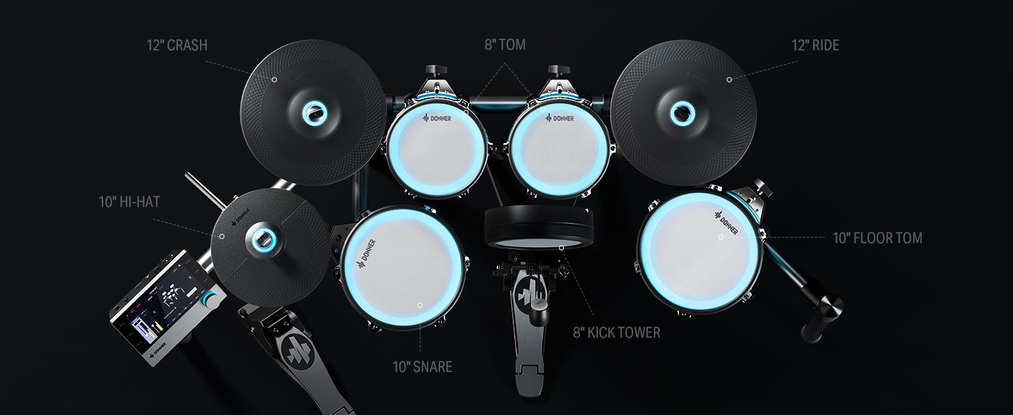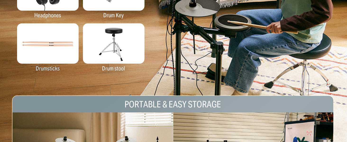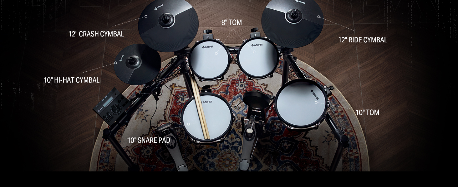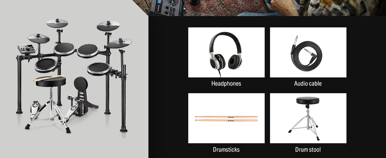 γ Premium 7-Piece Drum Set γThis portable and foldable electric drum set includes 1 x 8" mesh snare drum, 3 x 8" mesh tom drums, 3 x 10" cymbals, drum module, drum throne, headphones, drumsticks, and all cables needed. Equipped with a kick pedal and a hi-hat pedal to ensure accurate sound production, delivering authentic and precise performance feedback for drummers of all levels