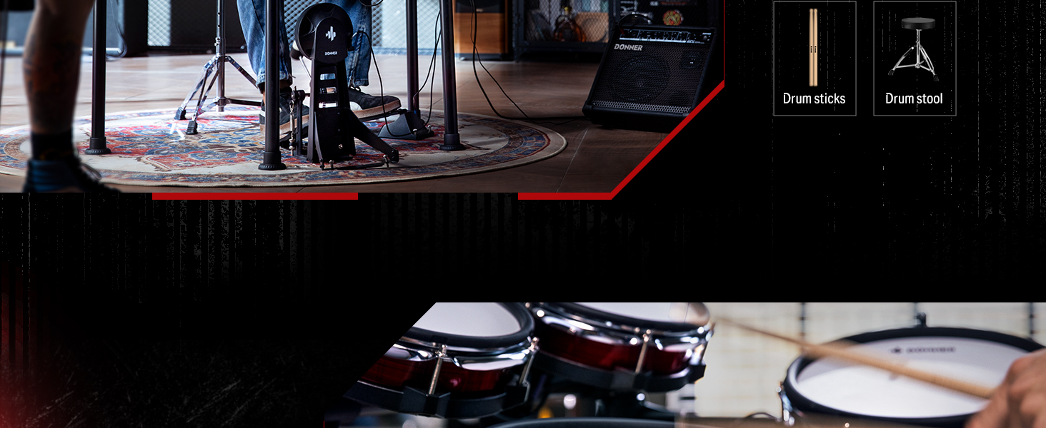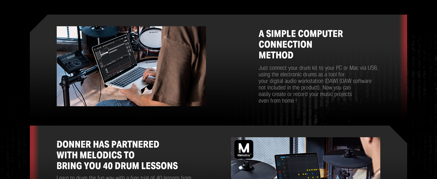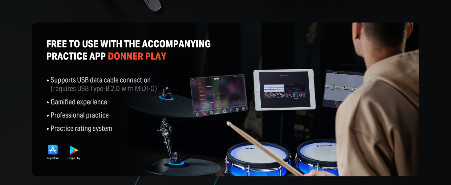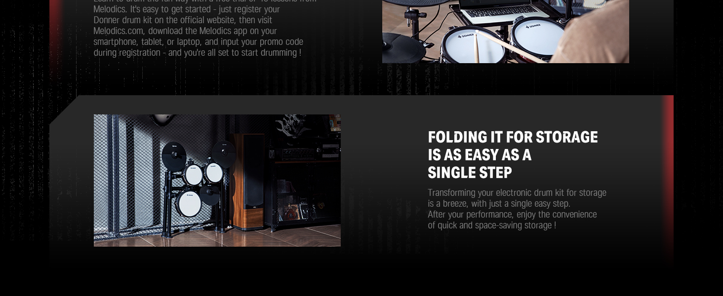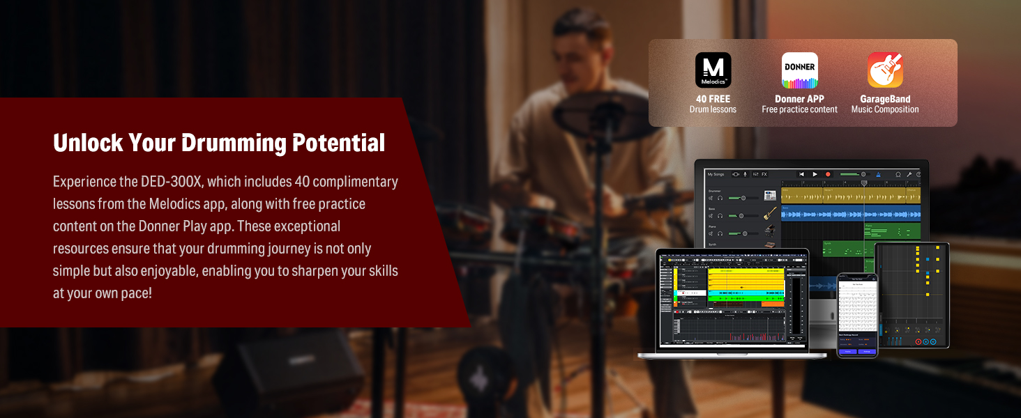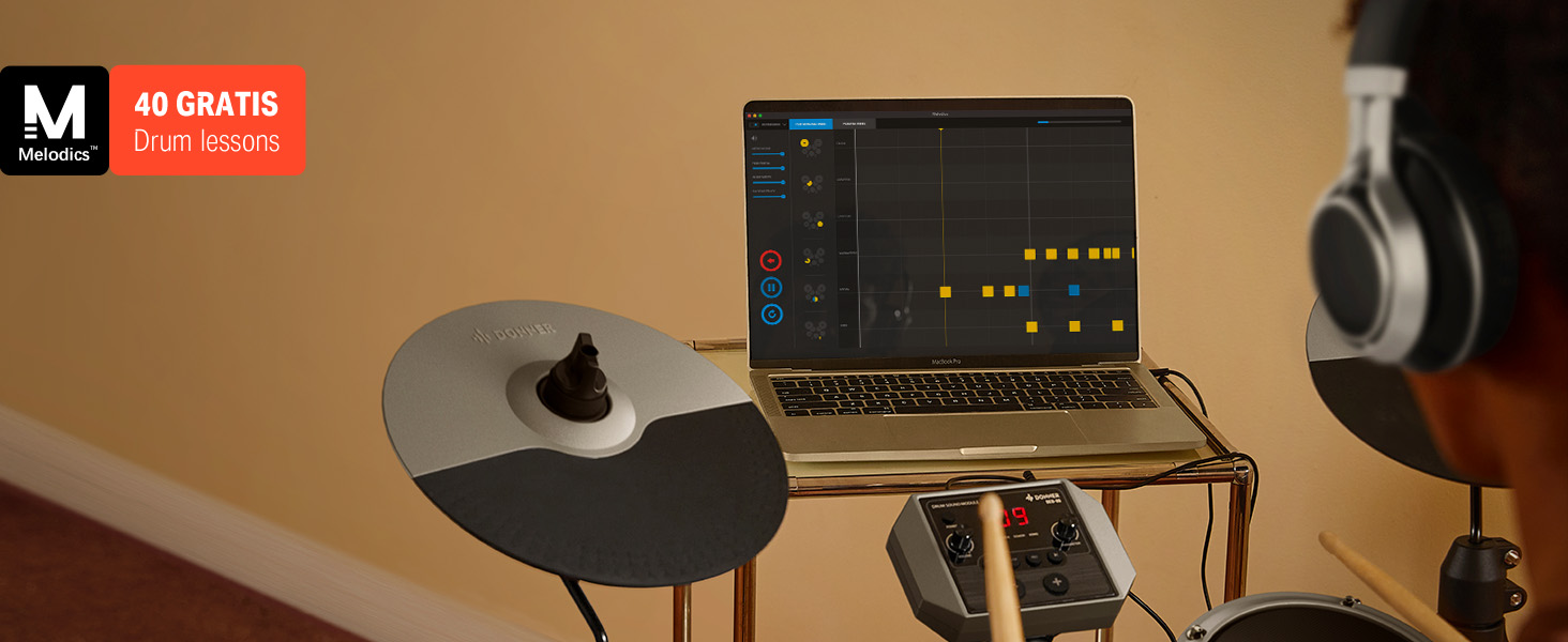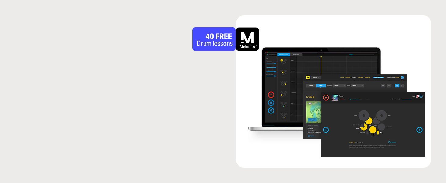 γ Interactive Drum Kit Lessons γThis digital drum set offers 40 Gratis virtual lessons from Melodics for fun. You can hone your skills in any style. Don't forget to ask our customer service for access to these courses! TIPS: We do not offer subscription services