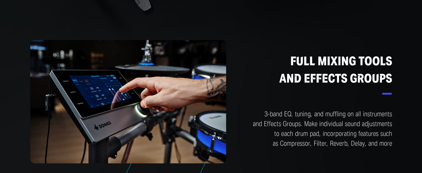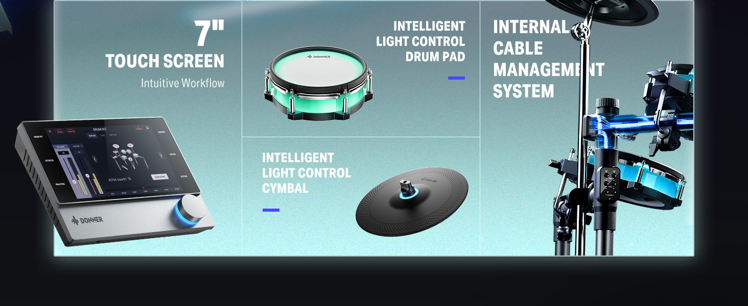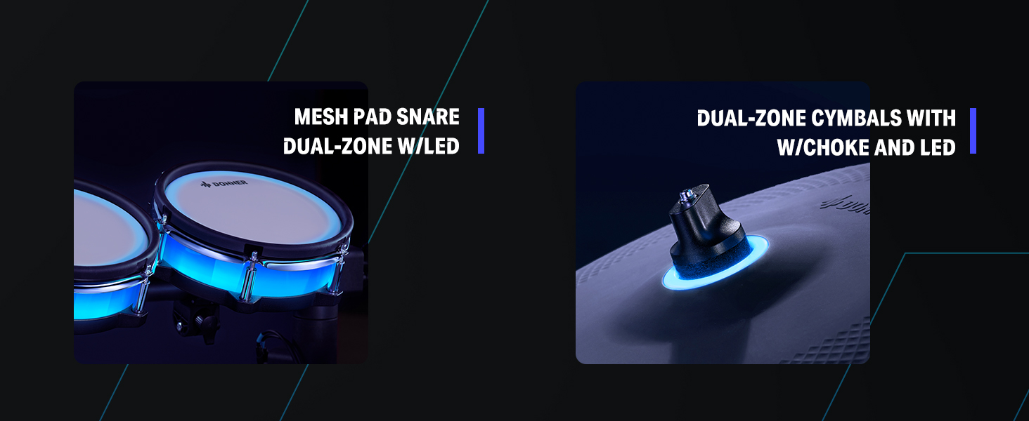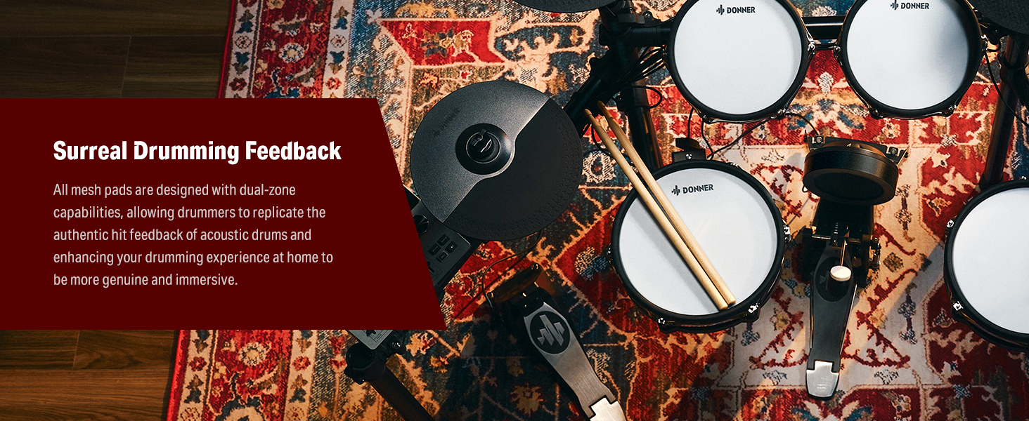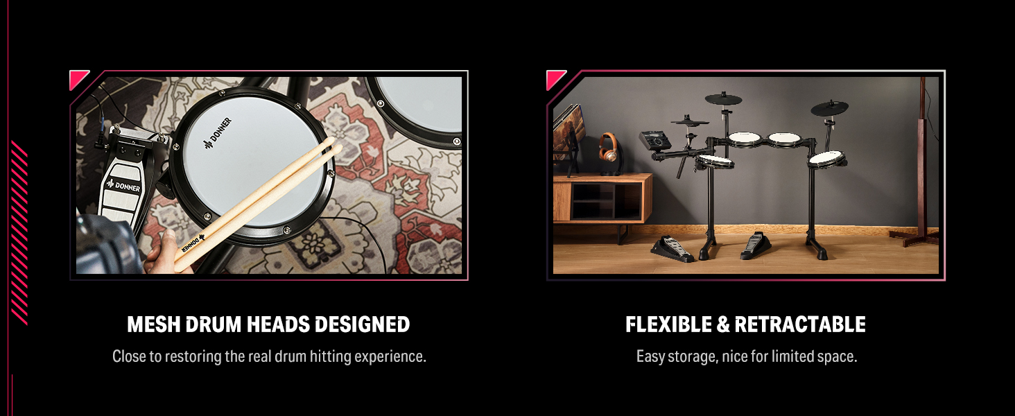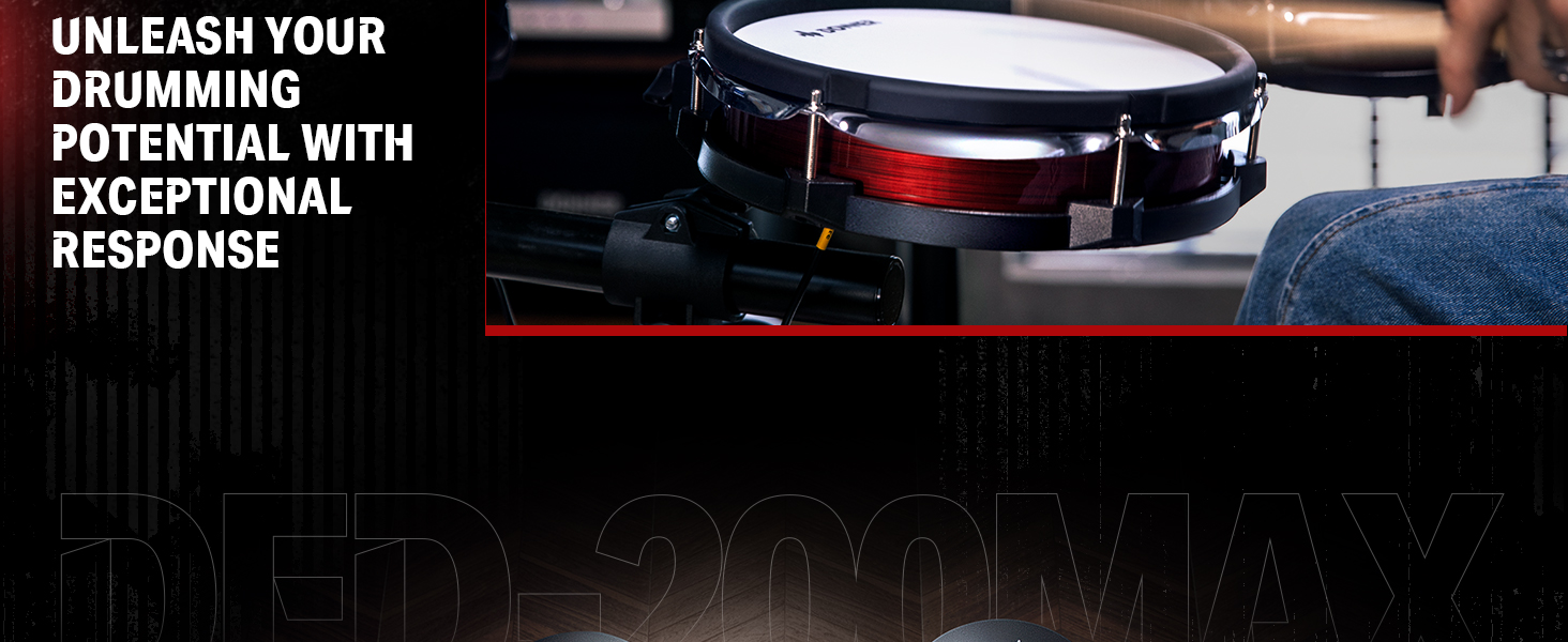 γ Industry Standard Mesh Heads γThe DED-200 Lite electronic drum kit utilizes a unique double-layered and high-density synthetic mesh for the drumheads to replicate an acoustic tactile feel and extend durability. Among them, the snare drum also offers an adjustable range for the drum position to accommodate different playing styles