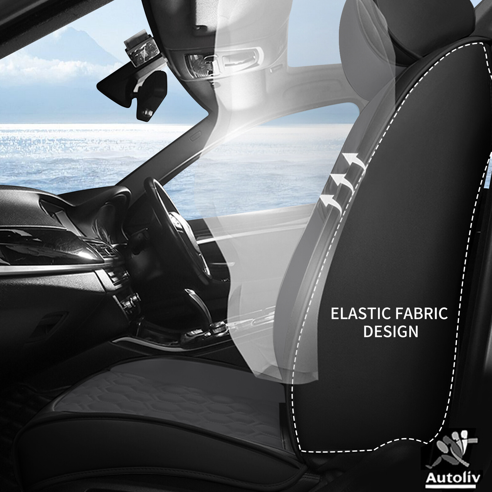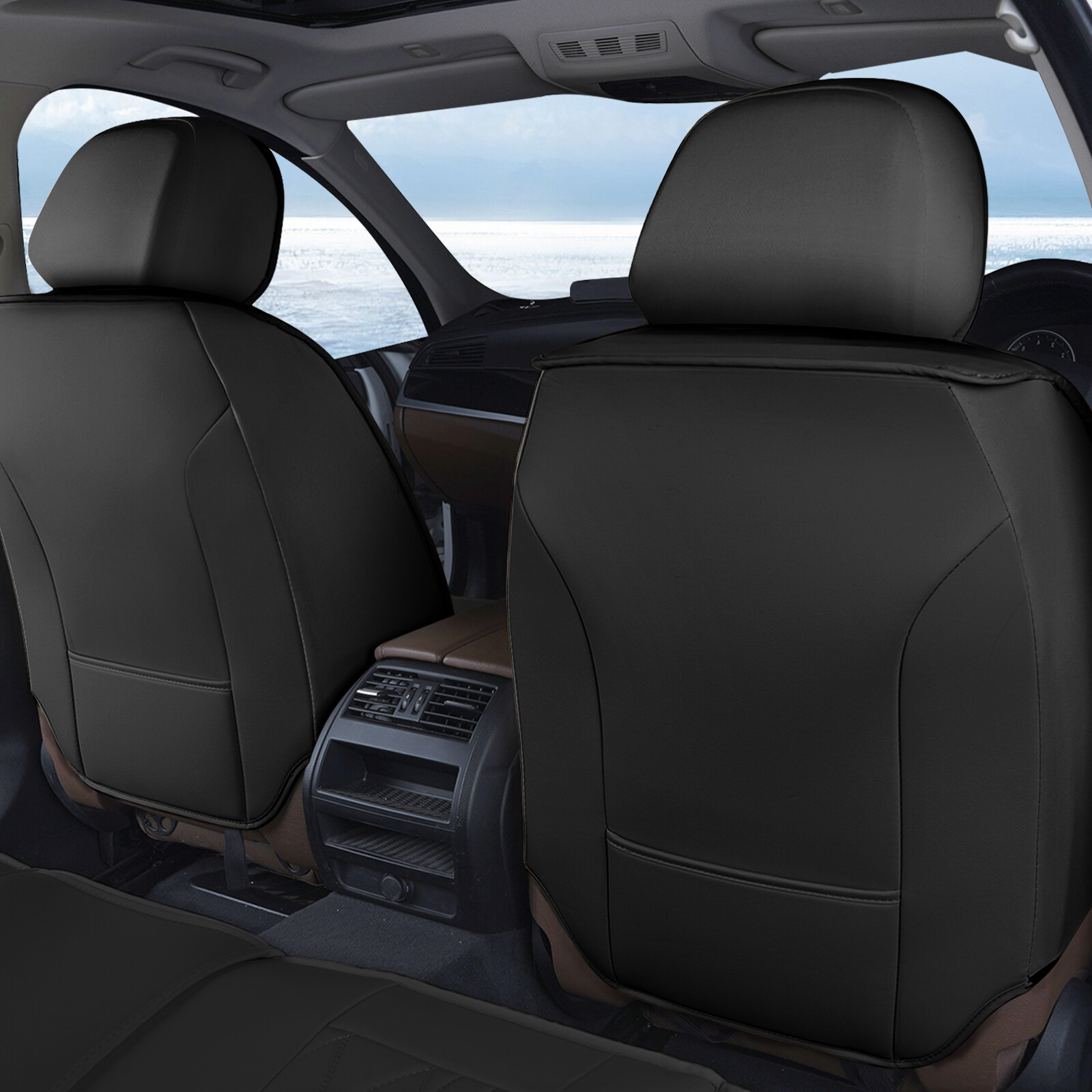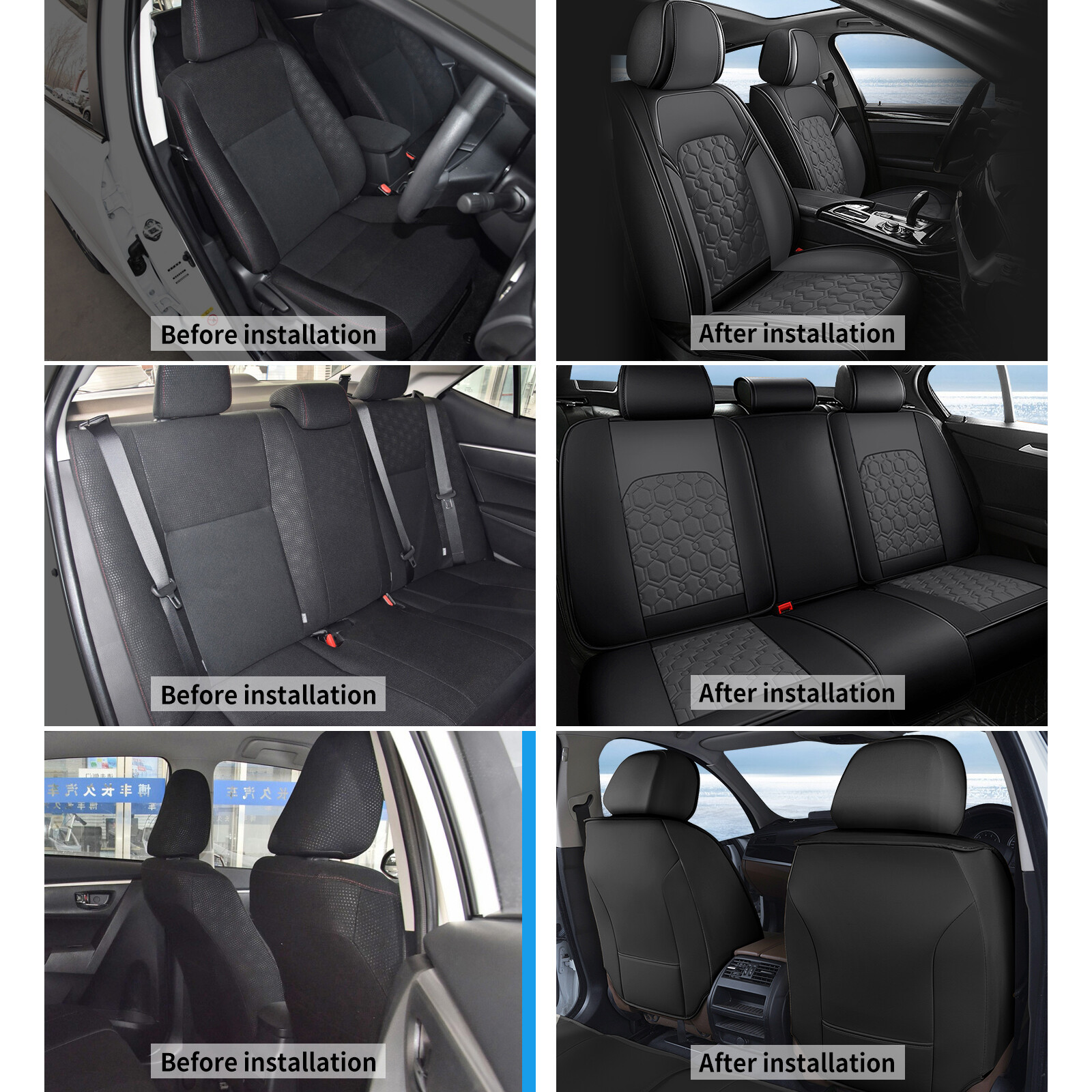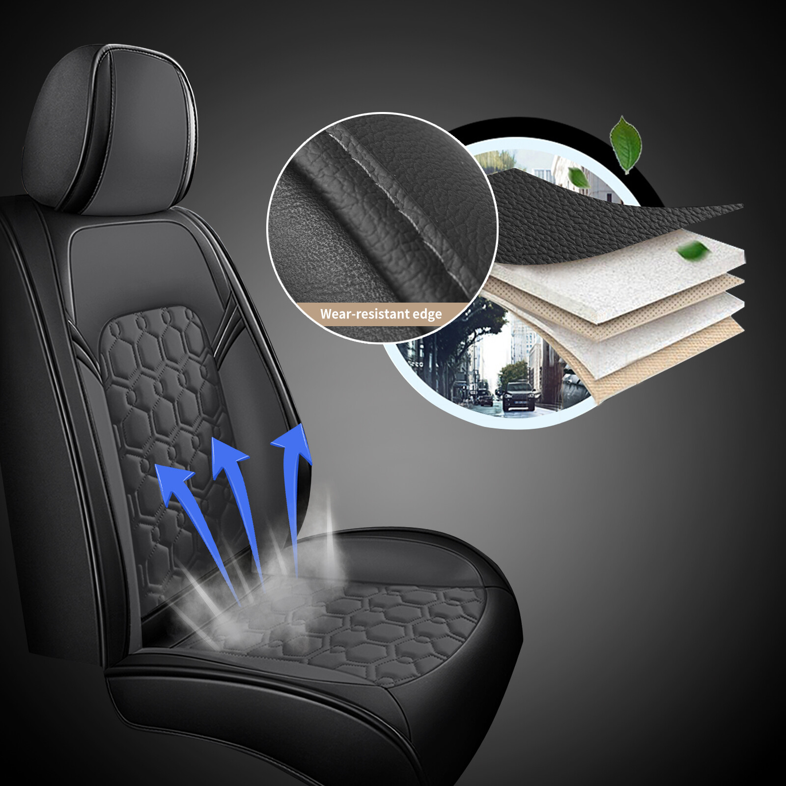 Material_ Premium faux leather is durable, wear resistant, breathable, non-slip, comfortable and has good waterproof. The interior of the seat cover is filled with sponge, the appropriate thickness allows you to sit for a long time without getting tired. There are 2 storage bags on the front seat covers that you can store small stuff.