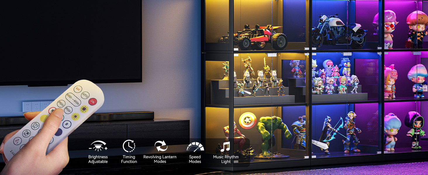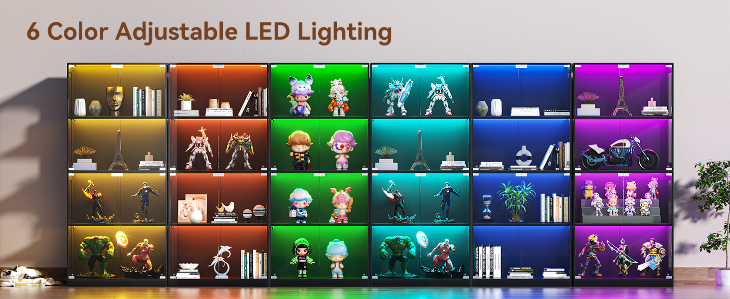 Smart Remote Control, Dazzling Illumination: Meulbaty glass display cabinets feature a six-color adjustable LED lighting system, allowing for flexible switching between warm and cool tones to suit any occasion. 4 tier corner display cabinets supports brightness adjustment, timer on/off, ticker effects, dynamic acceleration, and music-based modes. With a single click, bookshelve creates an immersive display experience, allowing your collection to shine.