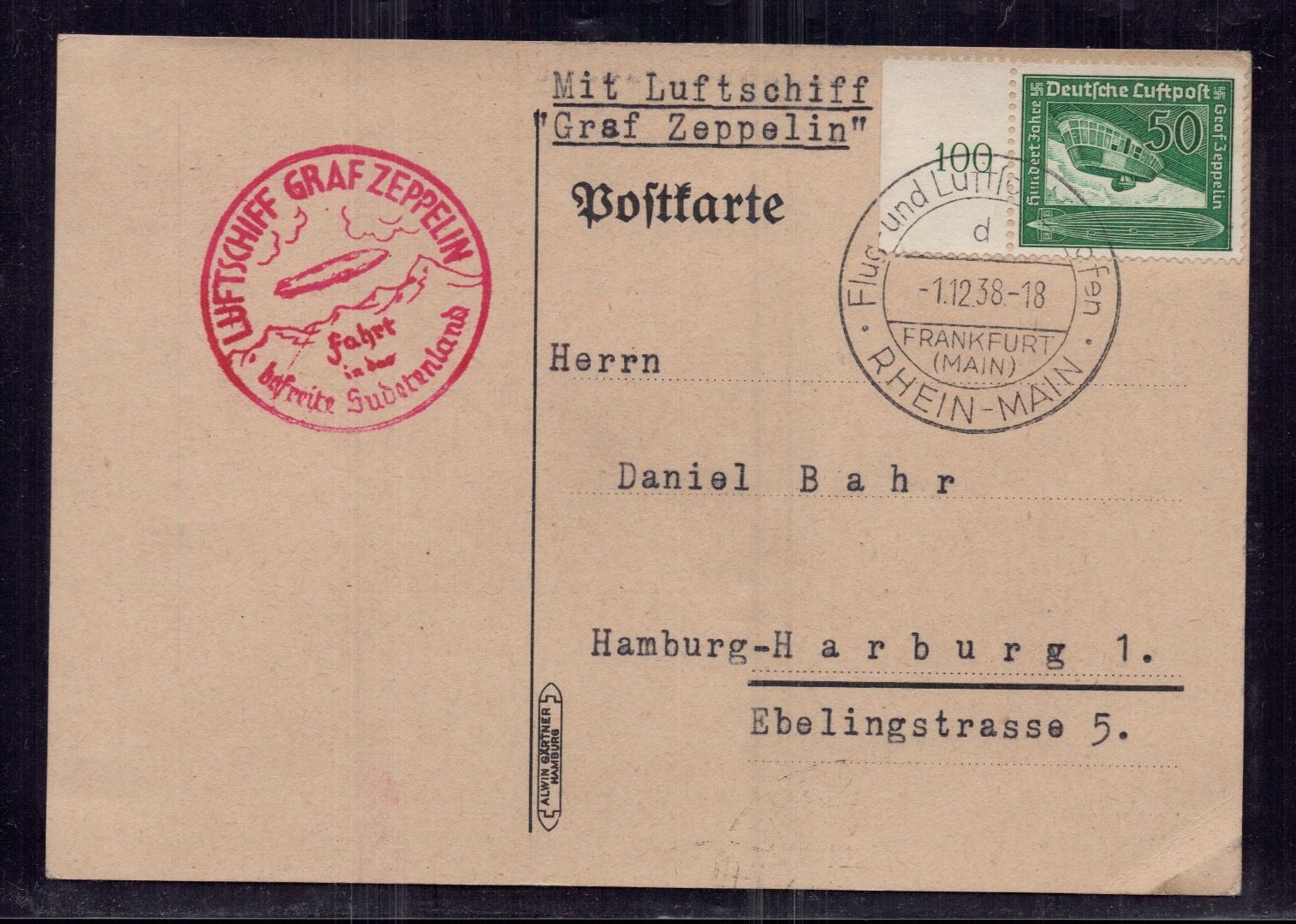DR Zeppelin Beleg Sudetenland Fahrt 1938 Frankfurt - Hamburg