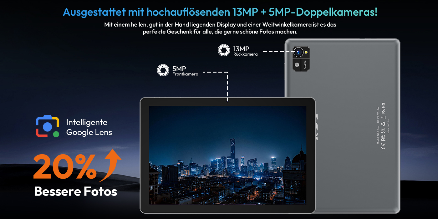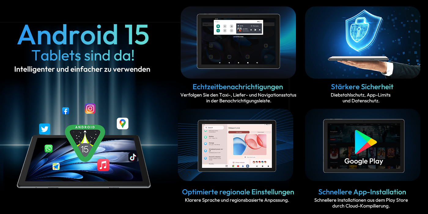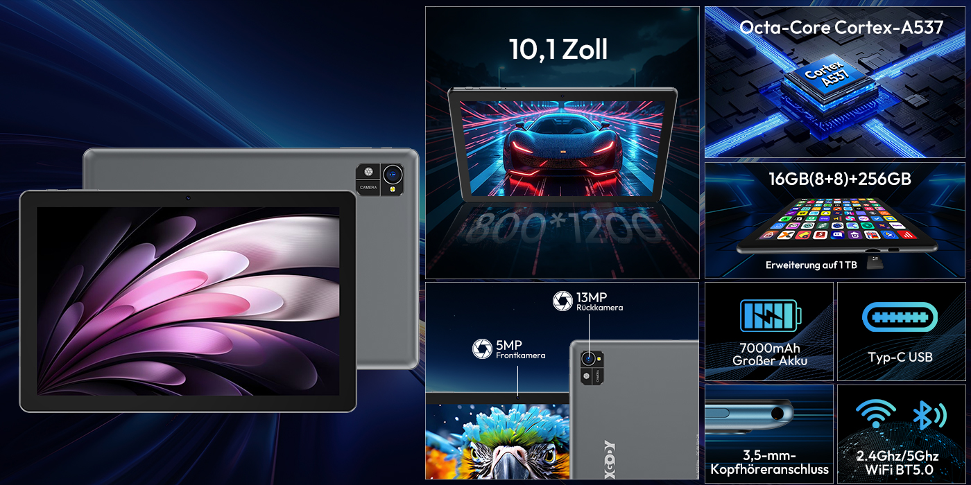 [Android 15 Stystem & Octa-Core-Prozessor] Das XGODY N02 Pro 10-Zoll-Tablet verfügt über das neueste Android 15-Betriebssystem und einen 2,0-GHz-Octa-Core-Prozessor, der eine hervorragende Leistung, nahtloses Multitasking und keine lästigen Anzeigen gewähr leistet. Verbesserte App-Berechtigungen betonen Datenschutz und Sicherheit und geben Ihnen die vollständige Management kontrolle. [16GB + 256GB großer Speicher] Unser Android 15 Tablet kommt mit 16GB (8 + 8GB) RAM, 256GB ROM und erweiterbarem Speicher bis zu 1TB TF-Karte (nicht im Lieferumfang enthalten), sicherste llung schneller App-Starts und eines reibungslosen Spieler leb nisses. Das XGODY-Tablet ist auch mit dem Google Play Store vor installiert, sodass Sie problemlos alle benötigten Apps wie Netflix, YouTube und mehr herunter laden können. [10.1-Zoll-HD-Display & 5MP + 13MP Dual-Kameras] Das XGODY N02 Android 15 Tablet verfügt über ein hoch auflösendes 1280 × 800 IPS-Display mit leuchtenden Farben und einem Breitbild-Display mit klareren, helleren und realistische ren Bildern. Die 5-Megapixel-Front-und 13-Megapixel-Rückfahrkameras erfüllen problemlos Ihre Anforderungen an Video anrufe, Online-Lernen und mehr. [7000mAh Akku mit großer Kapazität] Die eingebaute CPU mit hoher Kapazität und geringem Strom verbrauch bietet unserem XGODY 10.1-Zoll-Tablet eine Standby-Zeit von bis zu drei Tagen, sodass Sie bis zu acht Stunden gemischtes Lesen genießen können. Fernsehen, Spiele spielen und im Internet surfen. Es ist der perfekte Begleiter für Spiel und Studium! [Wi-Fi 6 + Bluetooth 5.0] Das XGODY N02 10-Zoll-Android-Tablet verfügt über die neueste WiFi-Technologie der sechsten Generation und ein verbessertes Bluetooth 5.0. Der integrierte Dual-Band-Chip macht 5G WiFi und 2.4G WiFi stabiler, und die neueste Bluetooth 5.0-Konnektivität unterstützt alle Ihre bevorzugten Zubehörteile, die Daten geschwindigkeiten erheblich zu verbessern, die Netzwerk kapazität zu erhöhen, und Verringerung der Netzwerk latenz. Hinweis: Dieses Tablet verfügt nicht über GPS. Das Tablet basiert auf Android und kann keine Konten direkt mit iOS-Systemen teilen. |