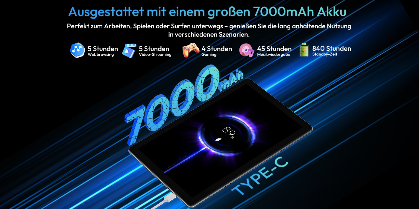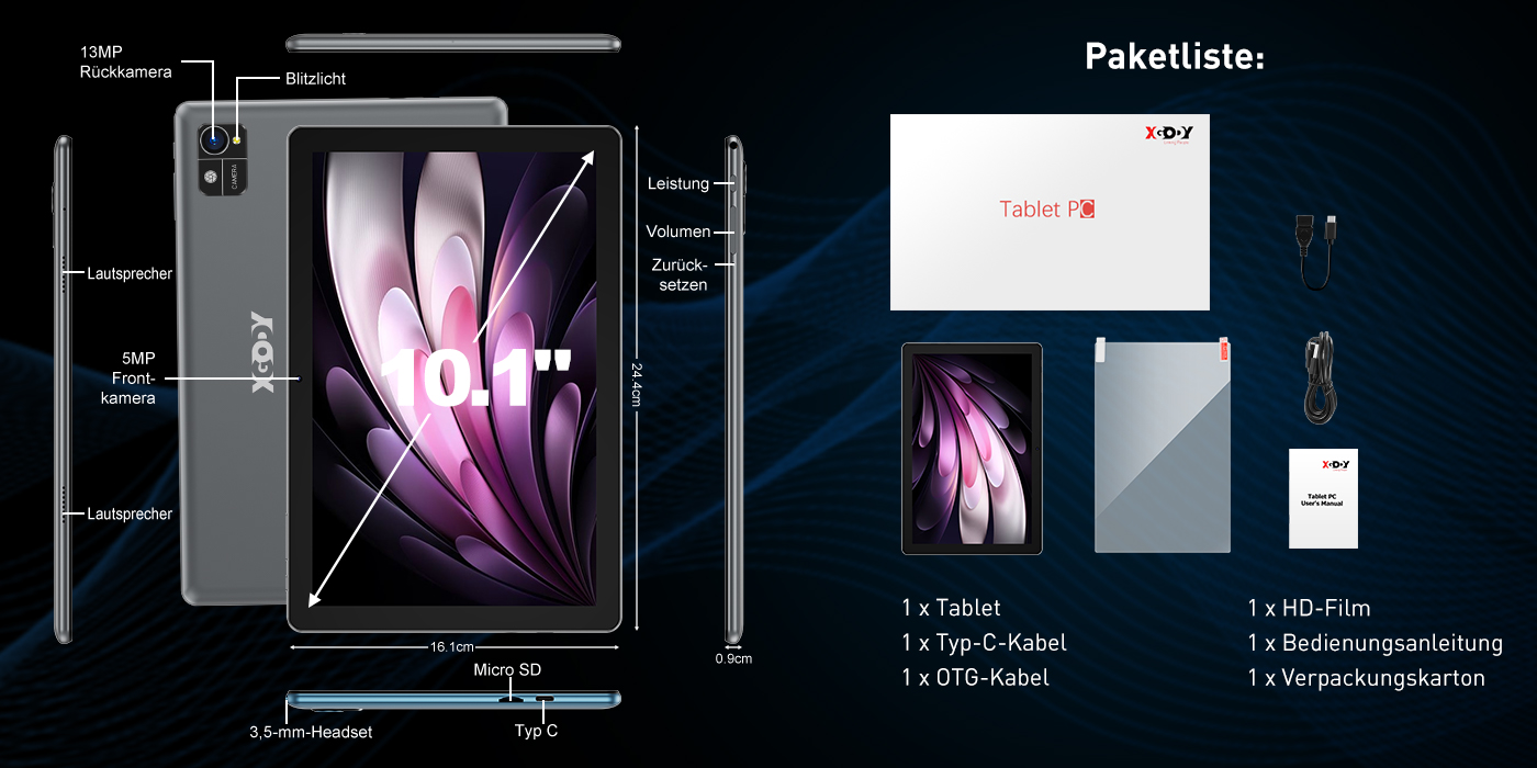 Frage: Welches Zubehör ist im Paket enthalten? Antwort: Sie erhalten ein Paket mit Tablet, HD-Film, Typ-C-Kabel, OTG-Kabel, Handbuch (englische und deutsche Versionen). |
