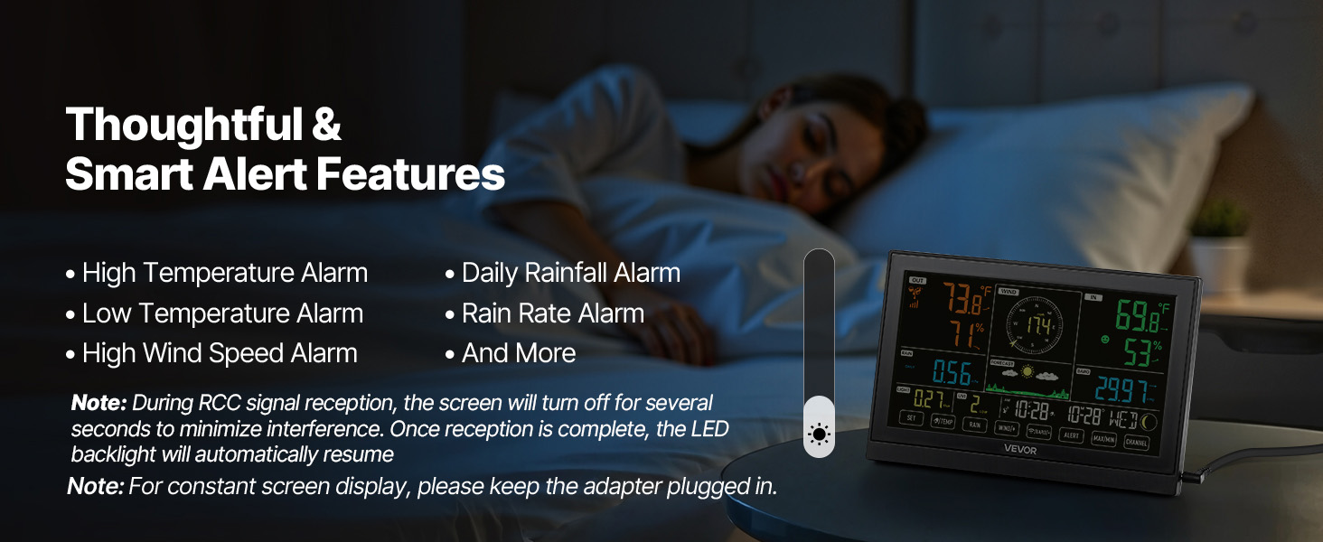 - Fonctions d'alerte intelligente : Notre station météo dispose d'alarmes de température élevée, de température basse, de vent fort, de précipitations quotidiennes, de taux de pluie. Soyez averti à temps pour protéger votre propriété et votre sécurité