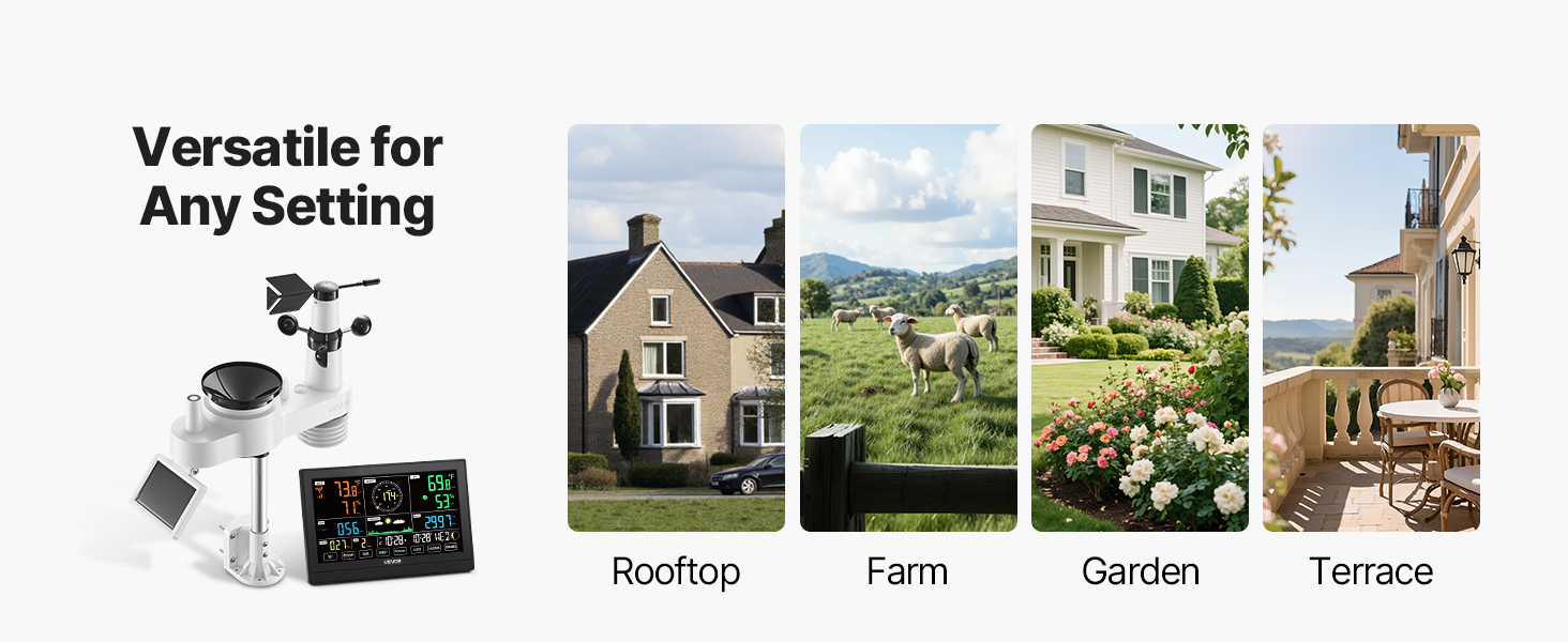 - Capteur extérieur 7-en-1 : Surveillez la température, l'humidité, les précipitations, la vitesse et la direction du vent, l'ensoleillement, etc., ainsi que le point de rosée, les phases de la lune et les prévisions à 6-12 heures. Les composants internes du capteur ont été entièrement mis à niveau pour une meilleure résistance à l'infiltration d'eau de pluie. Le collecteur de pluie, la girouette et le thermomètre sont préinstallés, ce qui vous fait gagner un temps précieux à l'installation