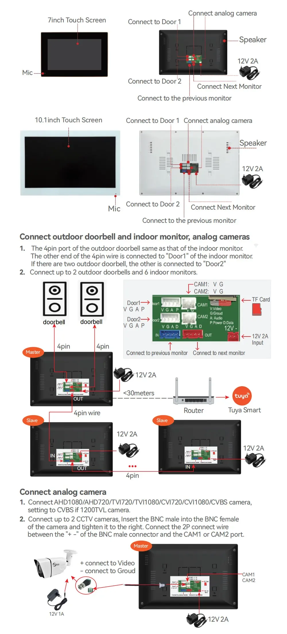 7 INCH TOUCH MONITOR:7-inch touch screen, door answering, monitoring and unlocking, two-way intercom Silent door intercom and doorbell kit.7-inch TFT touch screen monitor, ultra-slim design, support Smart Tuya APP Wireless Wi-Fi, hands-free intercom (Note that the monitor supports wireless connection, but the door phone and monitor need wired connection)