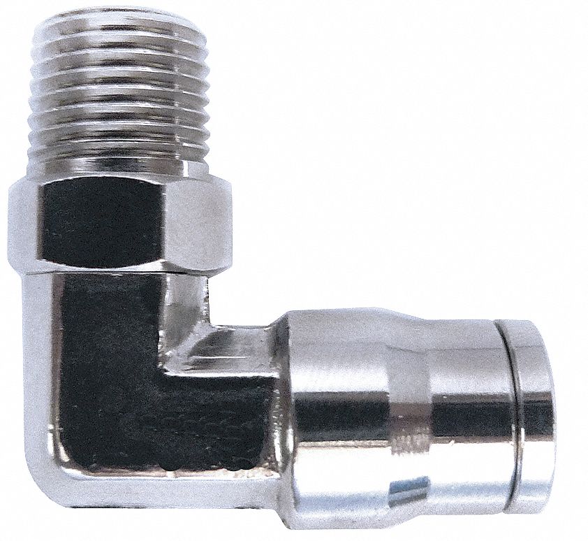 Male Elbow, Application Air, Oils, Fitting Side A Connection Type Push-to-Connect, Fitting Side B Connection Type MNPT, Fitting Side B Pipe Size 1/8 in, Fitting Side A Tube Outer Diameter 1/4 in, Fitting Material Brass, Fitting Thread Size 1/8, Color Silver, Includes Pre-Applied Thread Sealant No, Maximum Operating Pressure 250 psi, Maximum Operating Temperature 160 Degrees F, Specific Fitting Shape 90 Degrees Elbow Adapter, Release Type Ring, Finish/Coating Nickel Plated