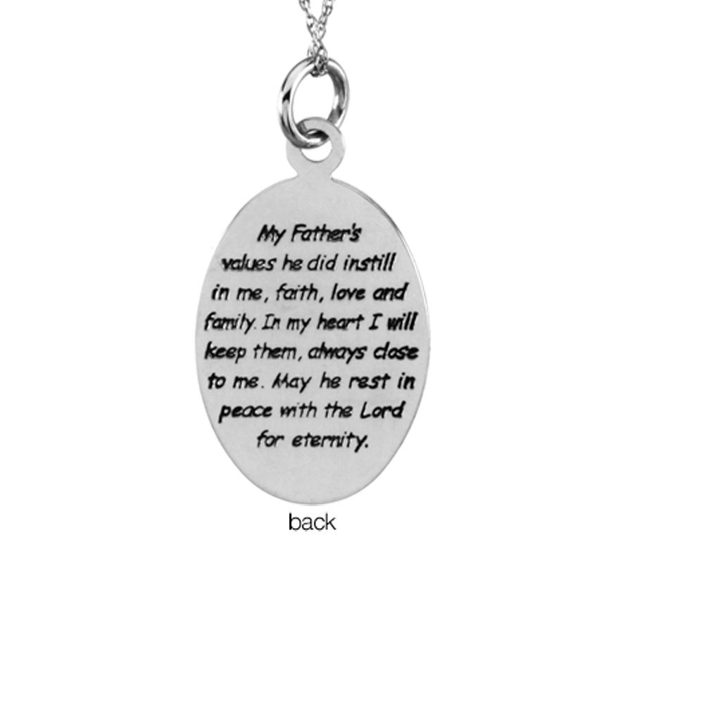 A comforting necklace for yourself or a loved one in need of support. The following poem is inscribed on the back: My Father's values he did instill in me, faith, love and family. In my heart I will keep them, always close to me. May he rest in peace with the Lord for eternity. Includes an 18 inch sterling silver solid rope chain. Sterling silver pendant is 3/4 inch x 5/8 inch.