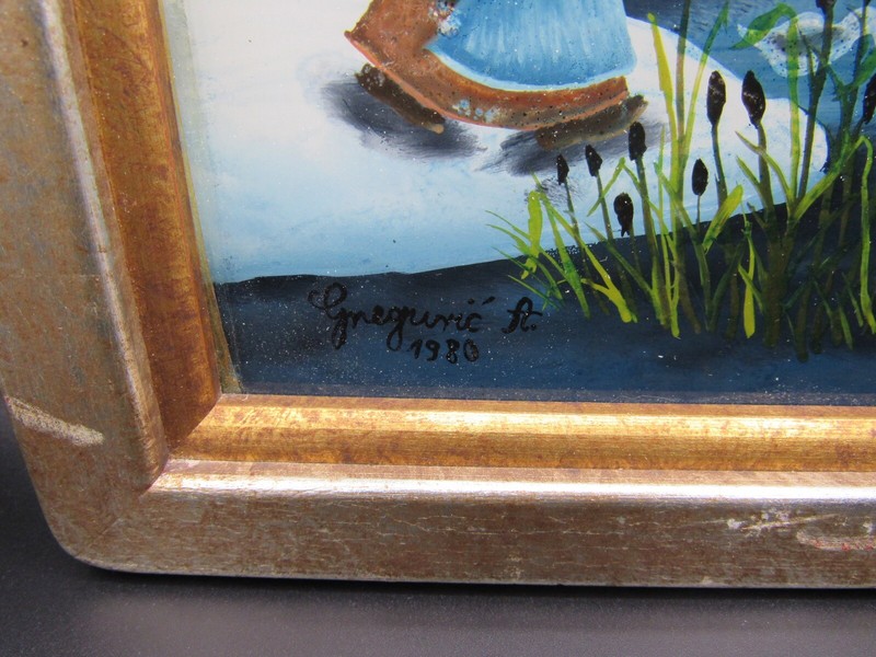 - In good condition except for some paint loss to cloud in upper left, bottom edge of frame is scratched