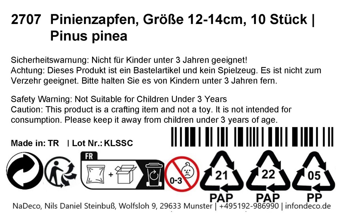 Unsere natürlichen Pinienzapfen aus der Türkei sind ein dekoratives Must-have für Ihre Weihnachts- und Gedenkfloristik. Mit einer Größe von 12-14 cm verleihen sie Trockengestecken, Adventskränzen und Weihnachtsbäumen eine rustikale Eleganz. Diese Zapfen stammen von der Pinie, auch als Pinus Pinea bekannt, und sind Symbol für Unsterblichkeit. Der Karton enthält 10 Zapfen, die in der Höhe variieren und einen Durchmesser von etwa 9-10 cm haben. Nutzen Sie sie, um Ihre Weihnachtsdekoration zu verfeinern und in die natürliche Schönheit der Pinien einzutauchen.
