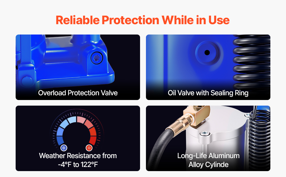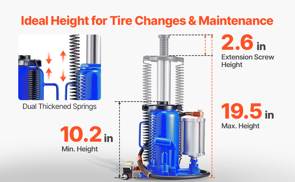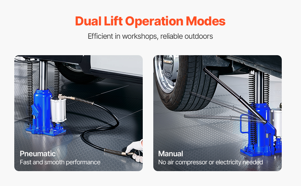 Este gato hidráulico de botella, manual y neumático, utiliza fuerza hidráulica para levantar hasta 20 toneladas con estabilidad. Realiza tareas pesadas como reparaciones de vehículos o mantenimiento del hogar en camiones, autocaravanas, camionetas y SUV.