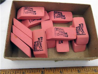 Original Pink Carnation pink wedge erasers — new old stock from an old stationery lot. These are unused and still have the black ink maker’s stamp on the face (“Pink Carnation,” Made in U.S.A.). Classic beveled rectangular style for pencils.