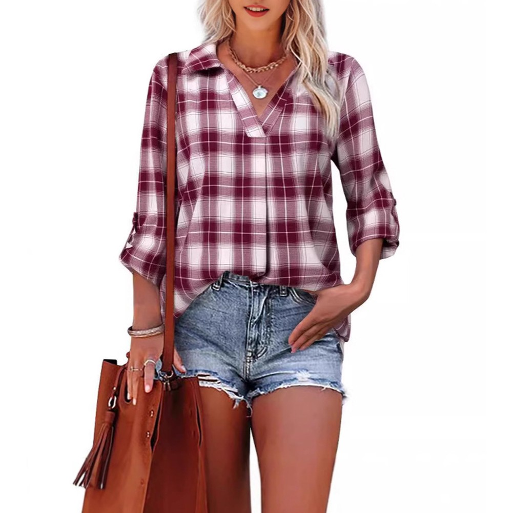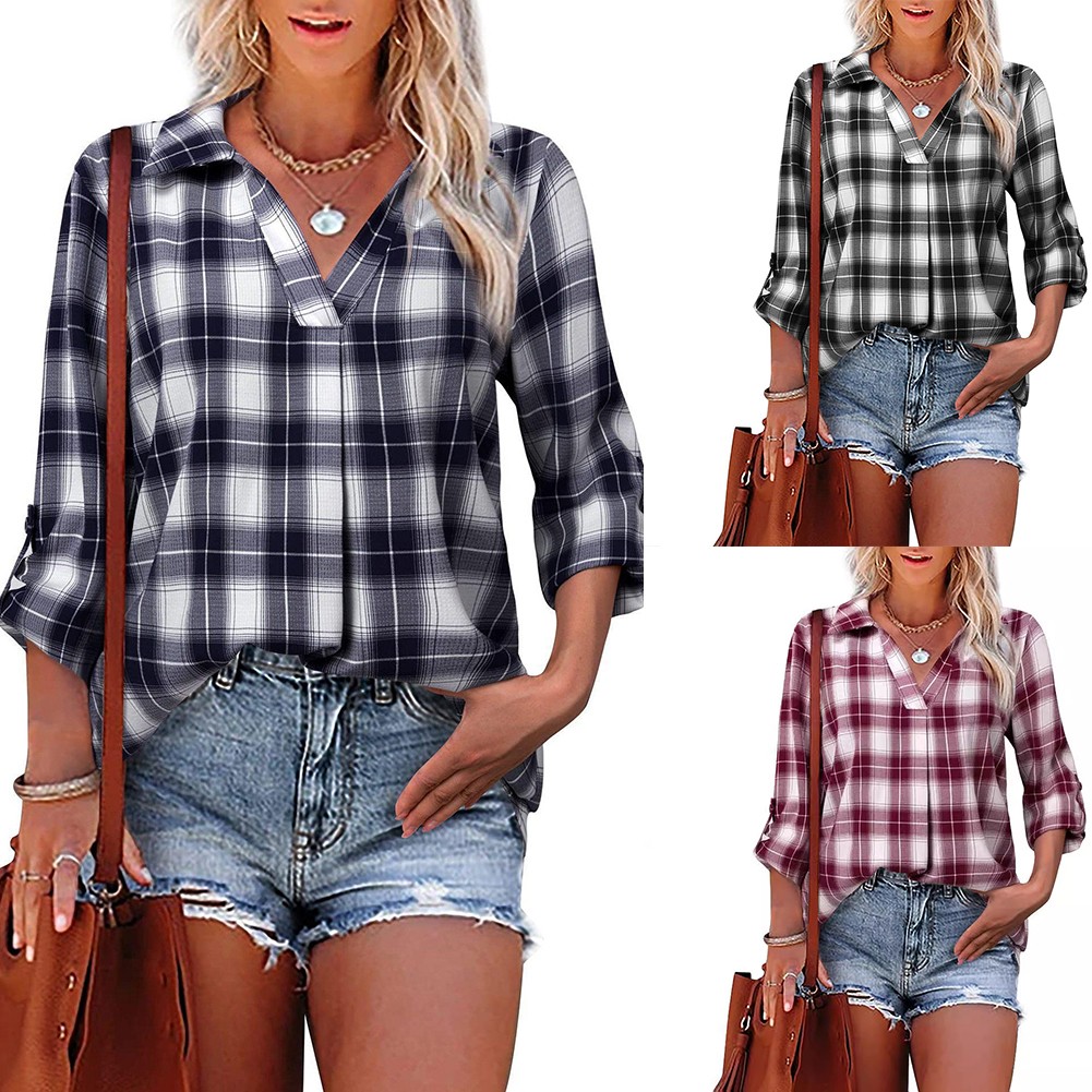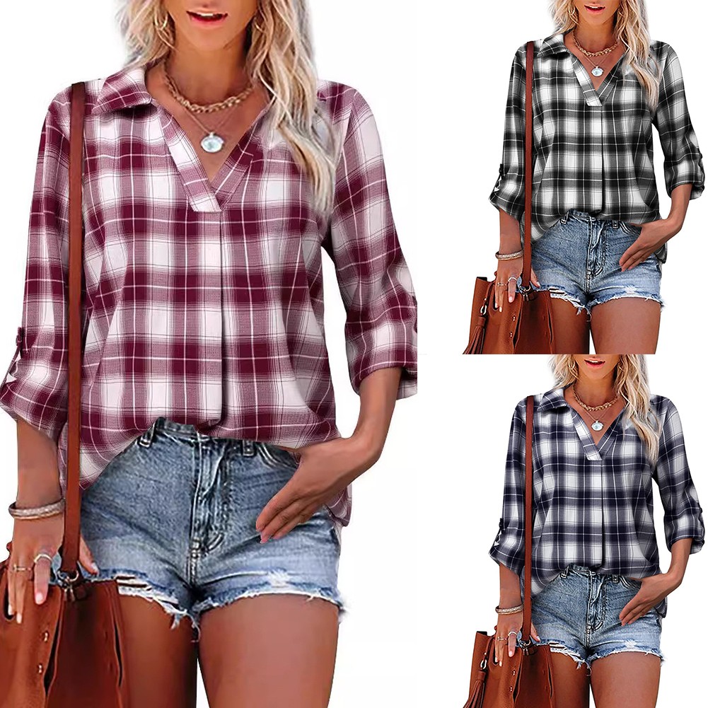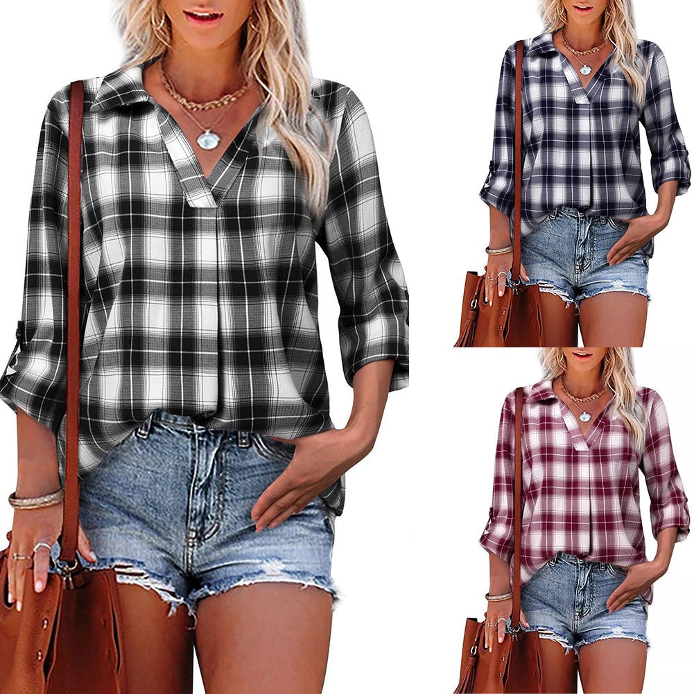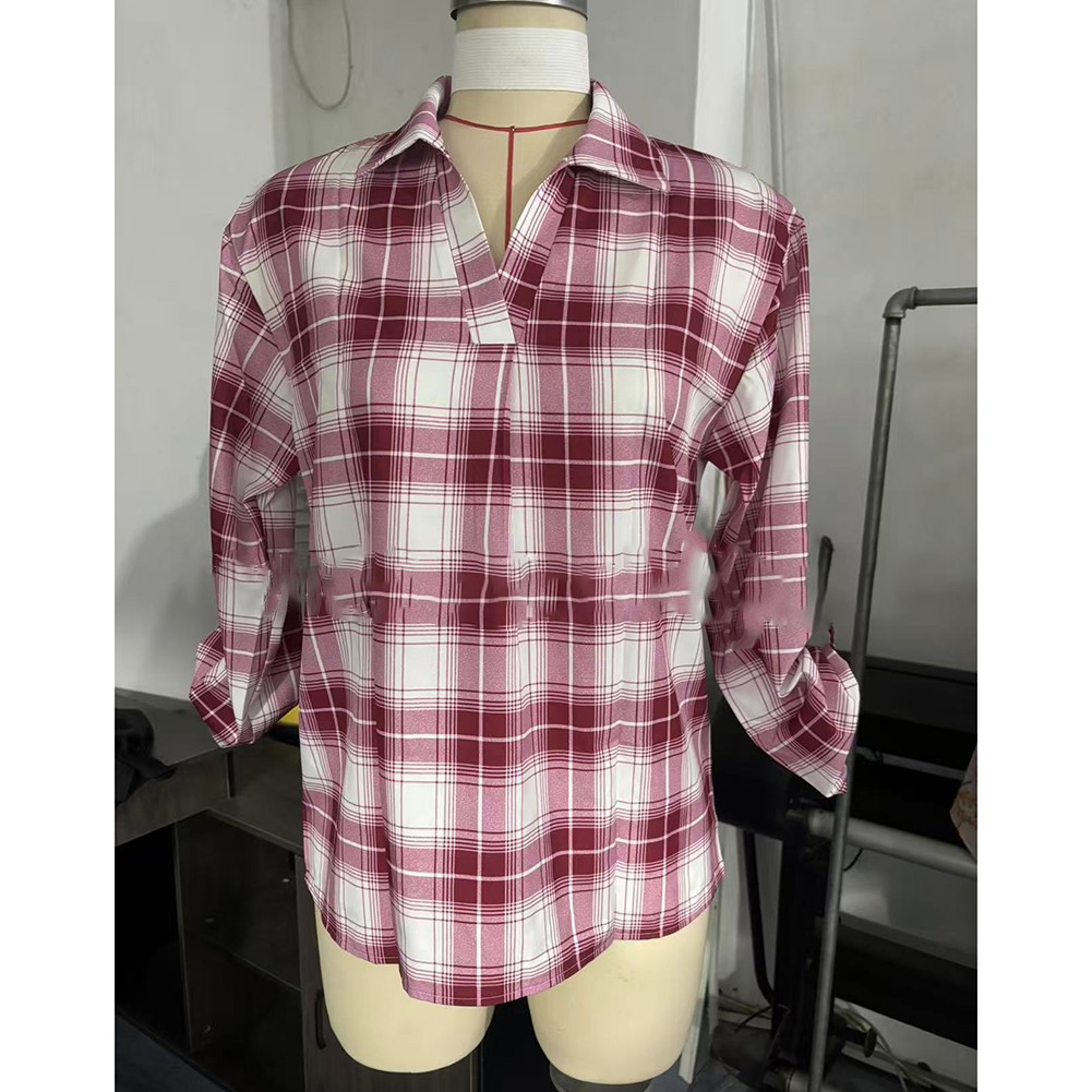 Pullover Lapel Loose Fit Women's Plaid Shirt