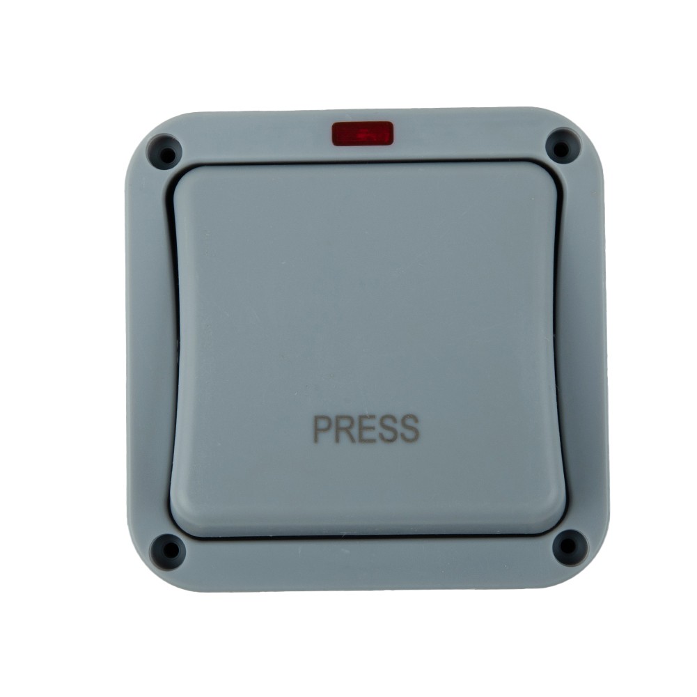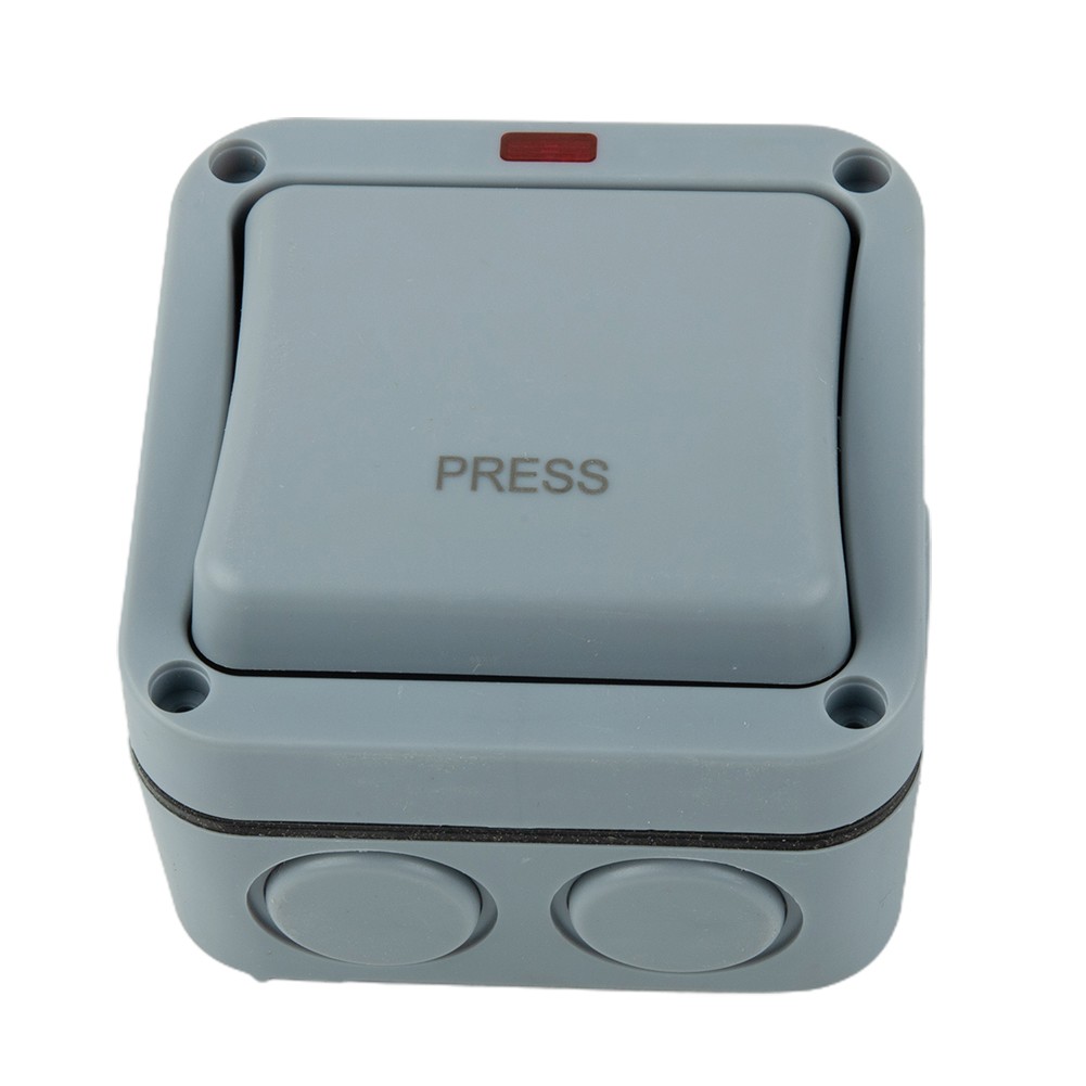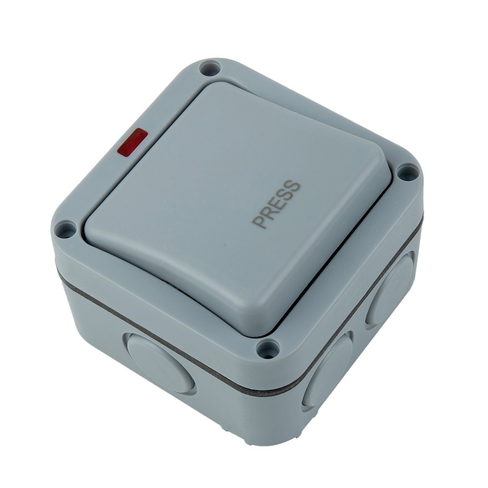 - 10A Outdoor Light Switch, IP65 Weatherproof, Grey Finish, Rugged Polycarbonate Housing, Multiple Gland Entry Positions.
